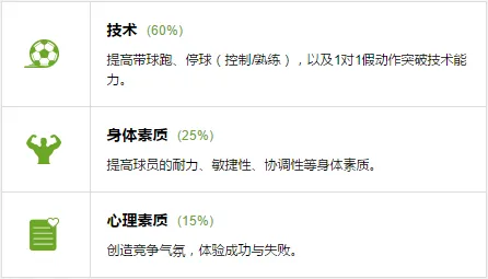 2. 该年龄段的球员不会在精神上理解团队的概念,所以练习的重点是球员的个人能力及创造力的体现。