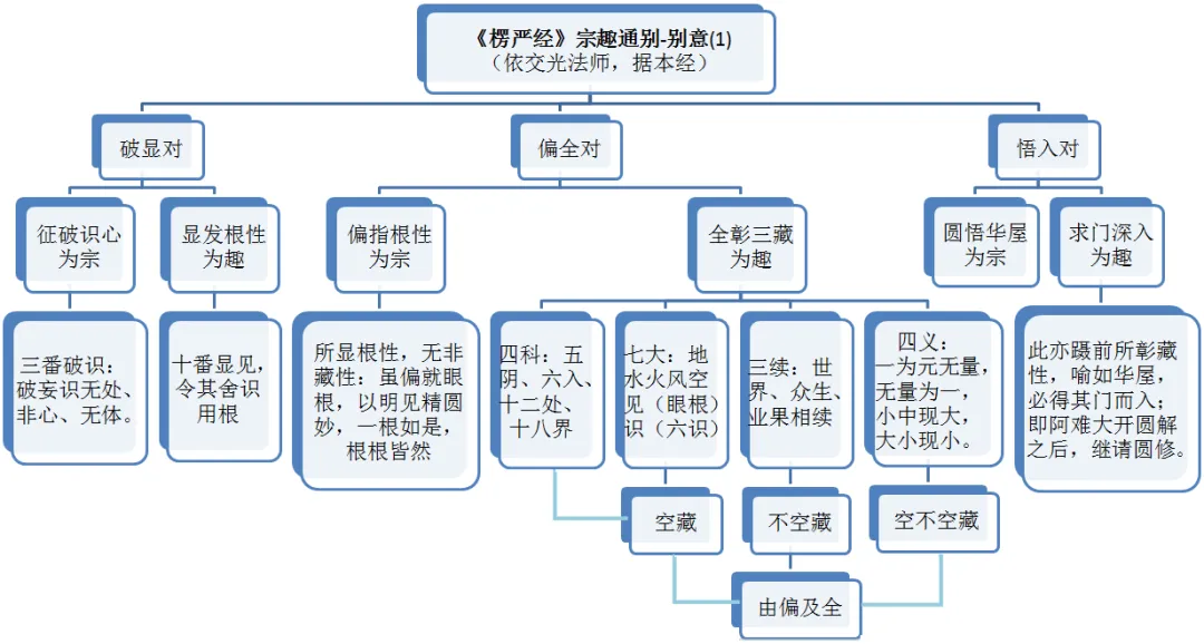 若明别意,以定宗趣,依交光法师,根据本经,应有六对:谓破、显;偏、全;悟、入;体、用;行、位;分、满也。