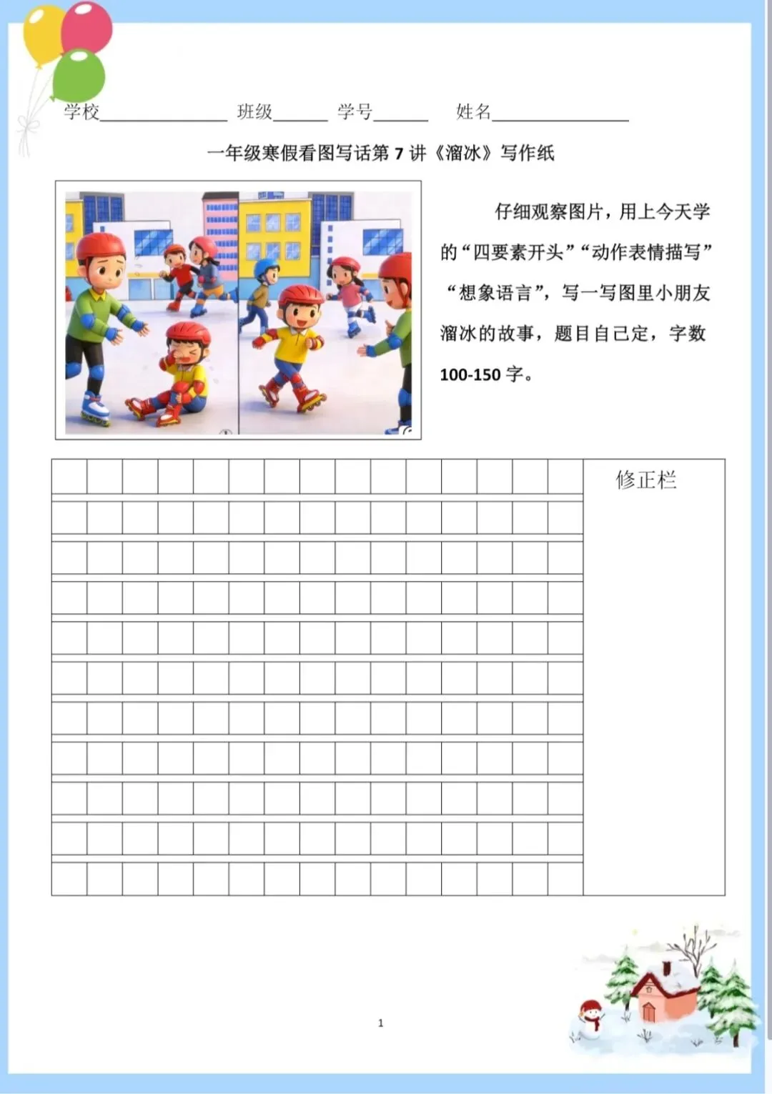 >寒假一年级看图写话|7 溜冰|课件、教案、写作纸、范文文档