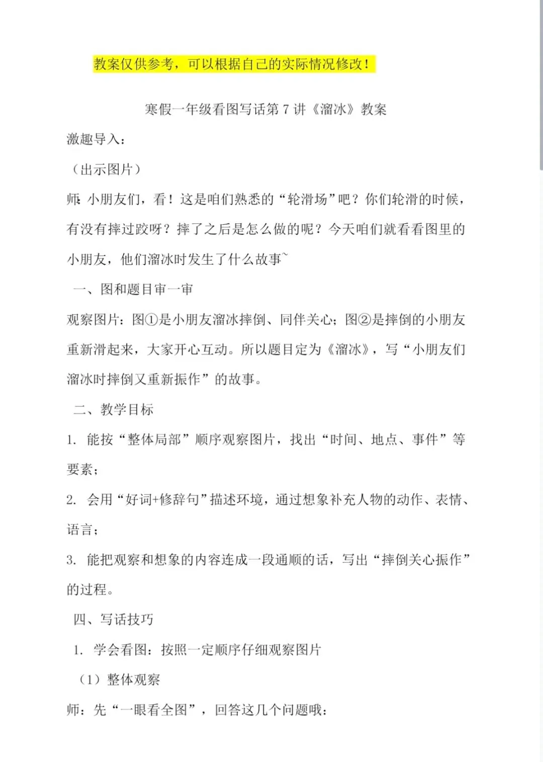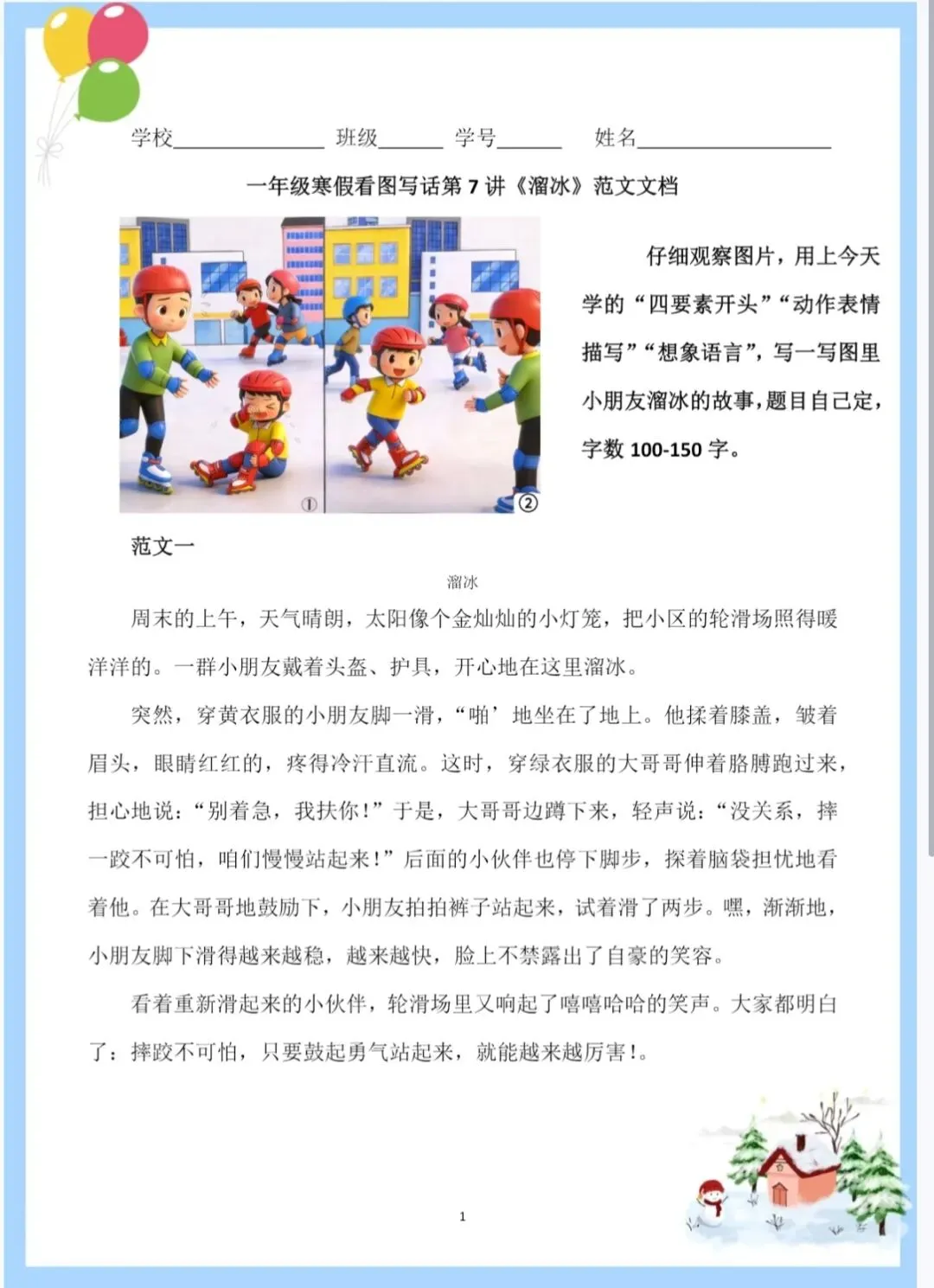 寒假一年级看图写话|7 溜冰|课件、教案、写作纸、范文文档