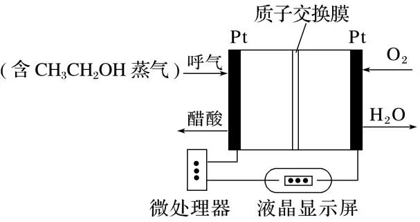 【解析】负极的电极反应式为CH3CH2OH-4e-+H2O===CH3COOH+4H+,A正确;氧气在正极上发生反应O2+4e-+4H+===2H2O,正极上消耗氢离子且产生的水对溶液稀释,氢离子浓度减小,一段时间后,正极区溶液的pH增大,故B正确;若外电路中转移4 mol电子,理论上右侧吸收1 mol氧气,内电路移入4 mol H+,电极附近溶液增重32 g+4 g=36 g,故C错误;液晶显示器上数字与电流强弱有关,显示器上的数字越大,说明电流越大,则负极放电的乙醇就越多,说明酒精含量越高,故D正确。