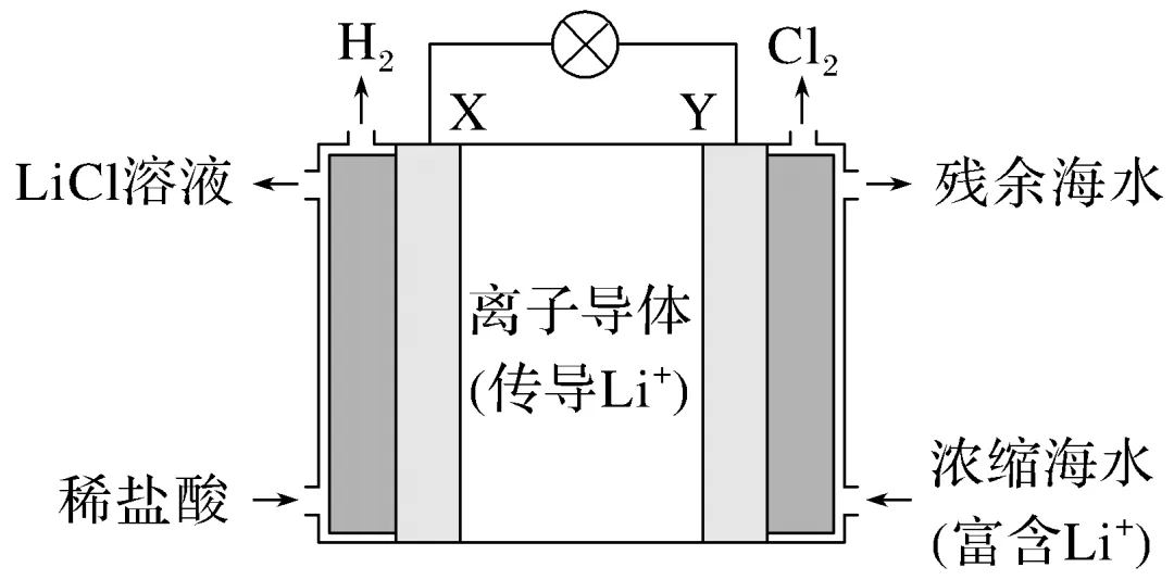 【解析】加入稀盐酸,X极上生成氢气,H+发生还原反应:2H++2e-===H2↑,X极为正极,Y极上Cl-发生氧化反应:2Cl--2e-===Cl2↑,Y极是负极,电池工作时,Li+向X极区移动,A、C正确;外电路中电流由正极X流向负极Y,B错误;Y极每生成1 mol Cl2,转移2 mol电子,有2 mol Li+向正极移动,则X极区得到2 mol LiCl,D正确。