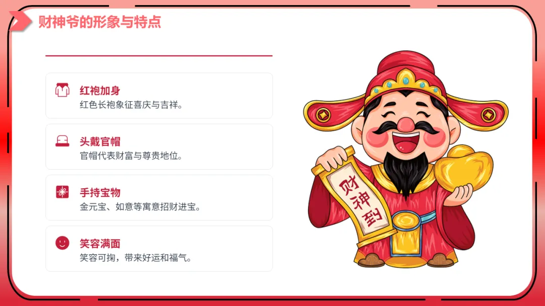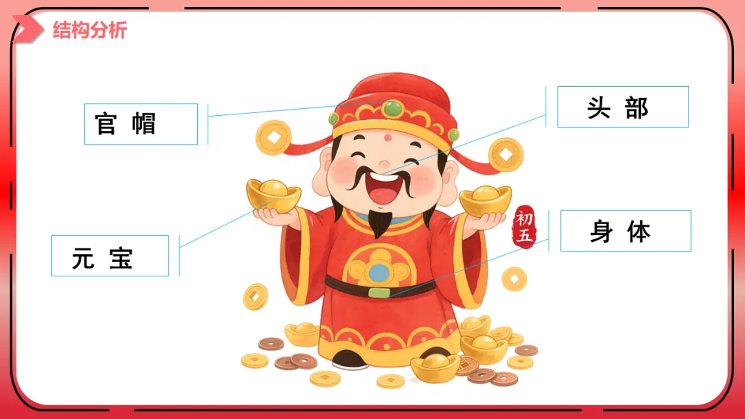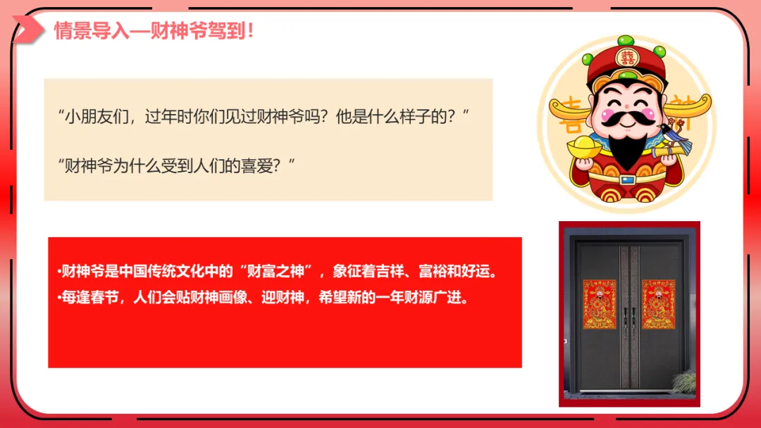 ①文化认知目标:了解财神爷的形象、文化寓意与传统节日习俗。