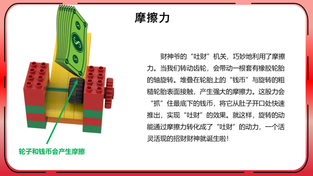 导课视频:视频介绍了如何迎接财神(课件中包含原视频)。详细讲解本节课学习的摩擦力的知识点以及在本次作品中的应用,加深理解。课程总结,这部分内容主要是方便老师做课后反馈,发家长群使用,老师们可根据需要做适当更改。各位家长好!