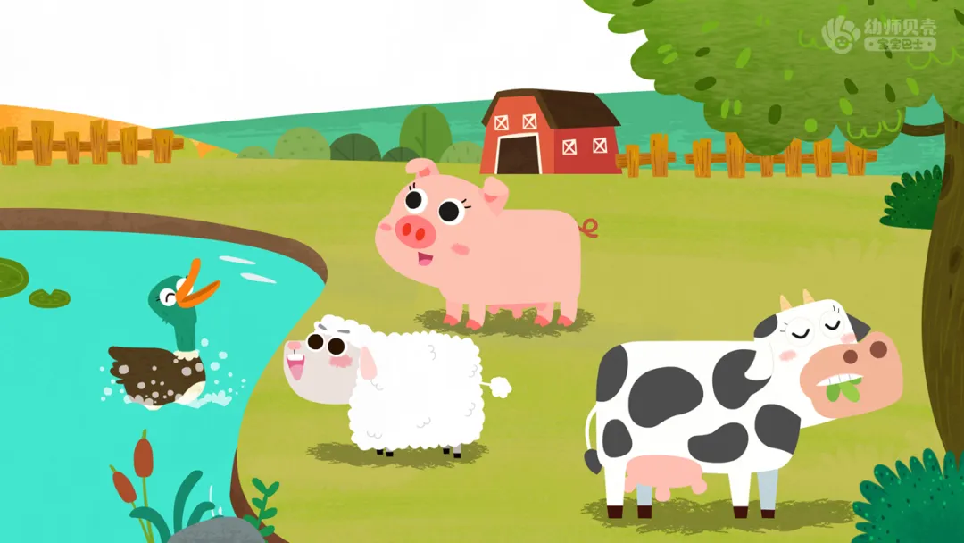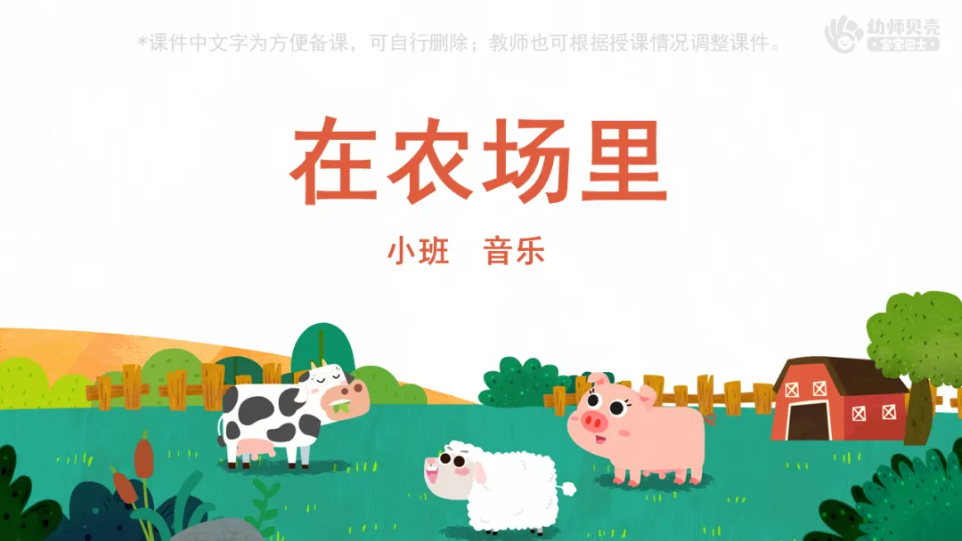 l课件准备:农场插图、小猪、小牛、小鸭、小羊动物的图片,《开火车》音乐音频,《猪》、《牛》、《鸭》歌曲音频,《在农场》歌曲伴奏音频。
