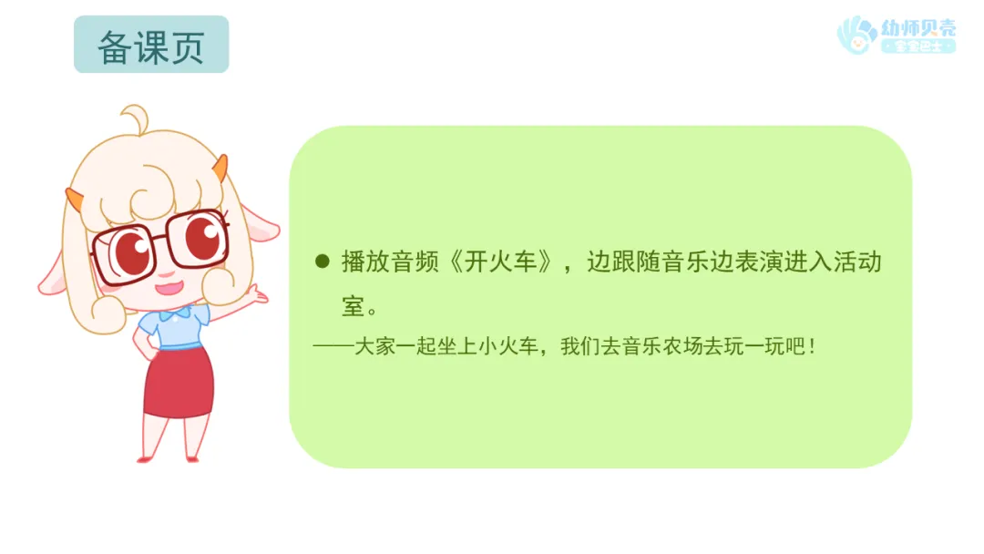 l播放音频《开火车》,边跟随音乐边表演进入活动室。