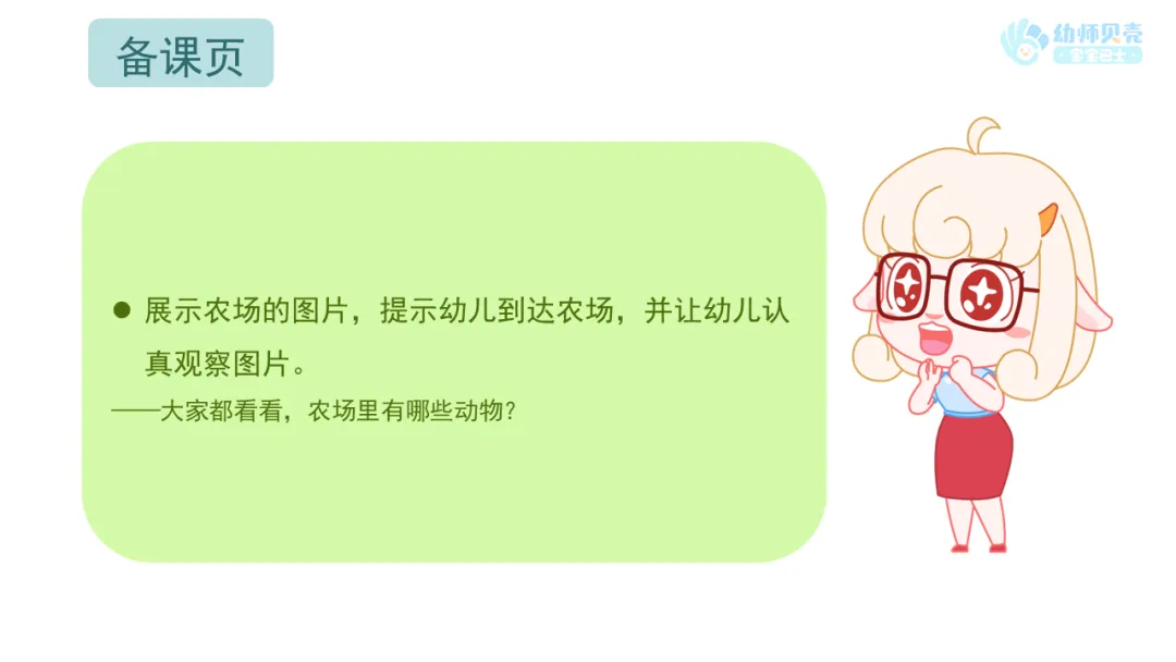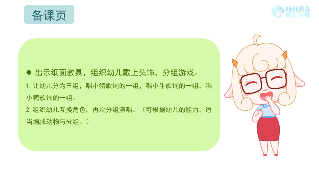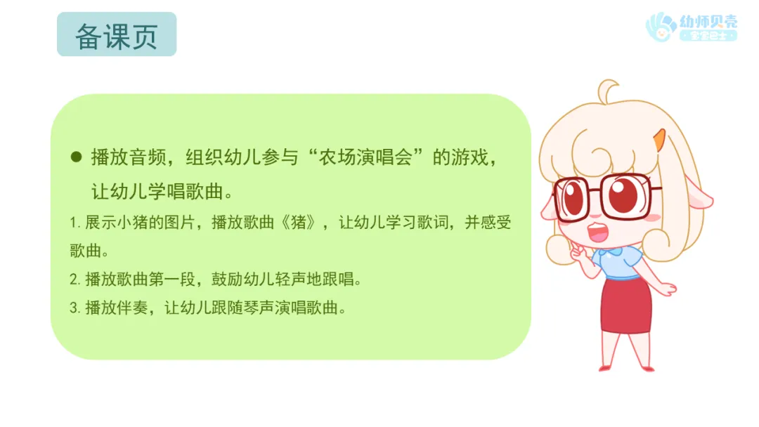 l播放音频,组织幼儿参与“农场演唱会”的游戏,让幼儿学唱歌曲。