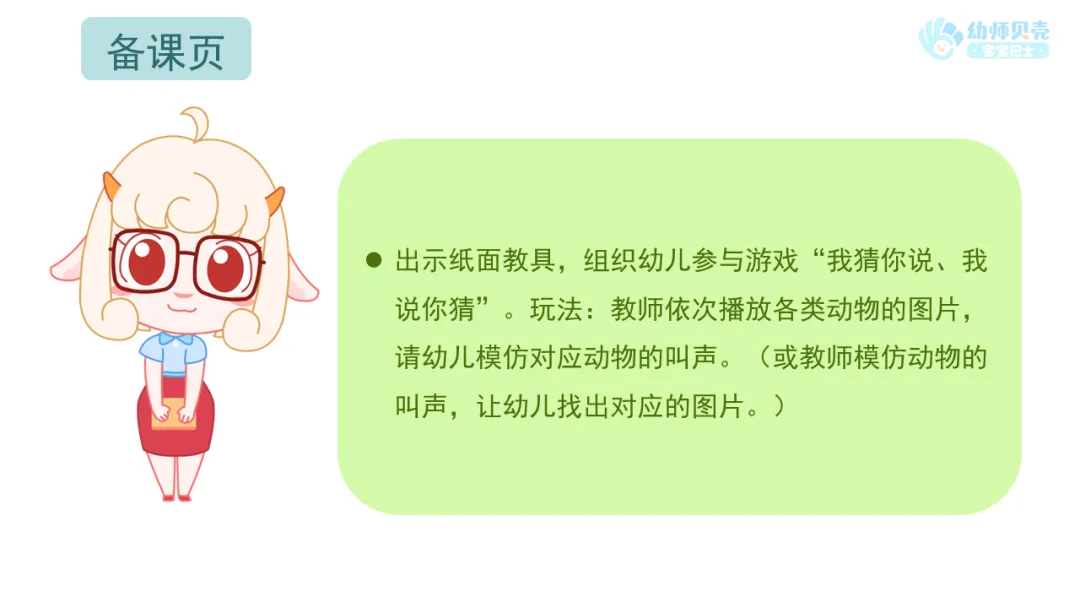 l出示纸面教具,组织幼儿参与游戏“我猜你说、我说你猜”。玩法:教师依次播放各类动物的图片,请幼儿模仿对应动物的叫声。(或教师模仿动物的叫声,让幼儿找出对应的图片。)