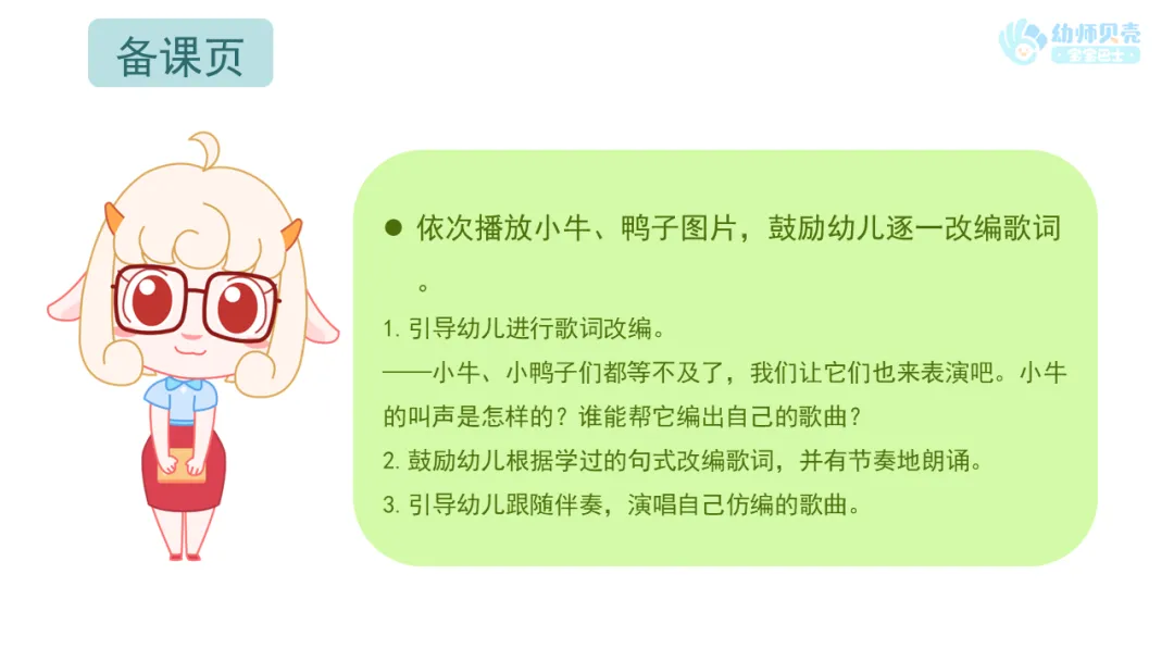 l依次播放小牛、鸭子图片,鼓励幼儿逐一改编歌词。