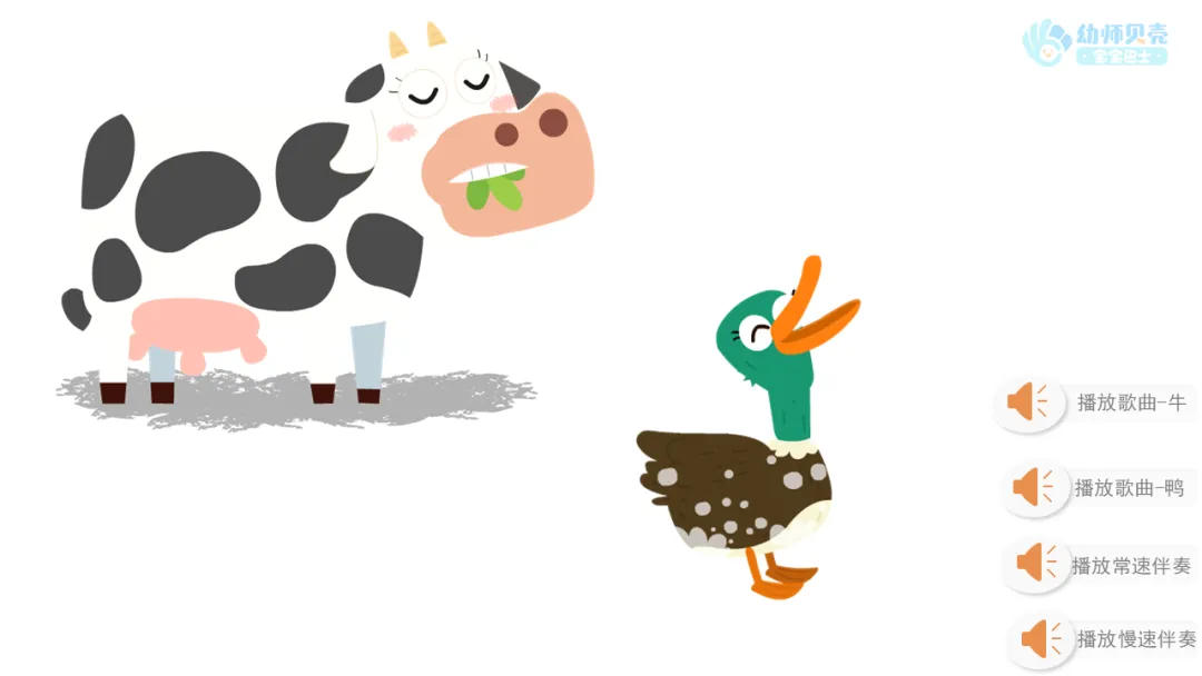 ——小牛、小鸭子们都等不及了,我们让它们也来表演吧。小牛的叫声是怎样的?谁能帮它编出自己的歌曲?