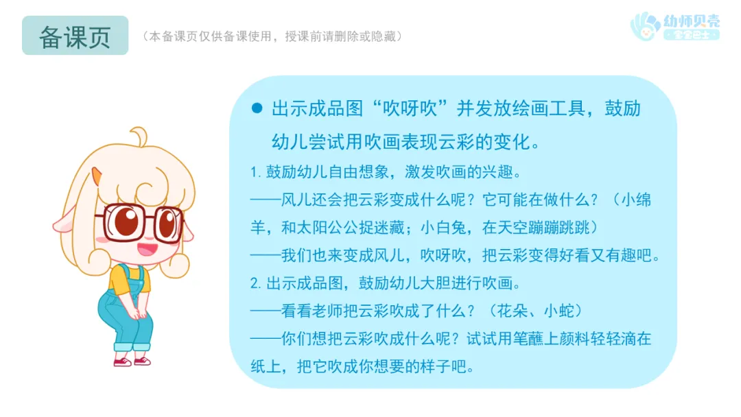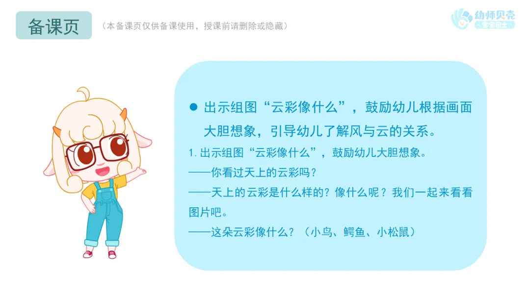 l课件准备:“云彩像什么”组图;《云彩和风儿》诗歌音频及图片;“吹呀吹”组图。