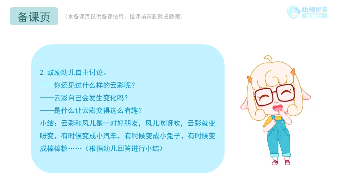 小结:云彩和风儿是一对好朋友,风儿吹呀吹,云彩就变呀变,有时候变成小汽车,有时候变成小兔子,有时候变成棒棒糖……(根据幼儿回答进行小结)