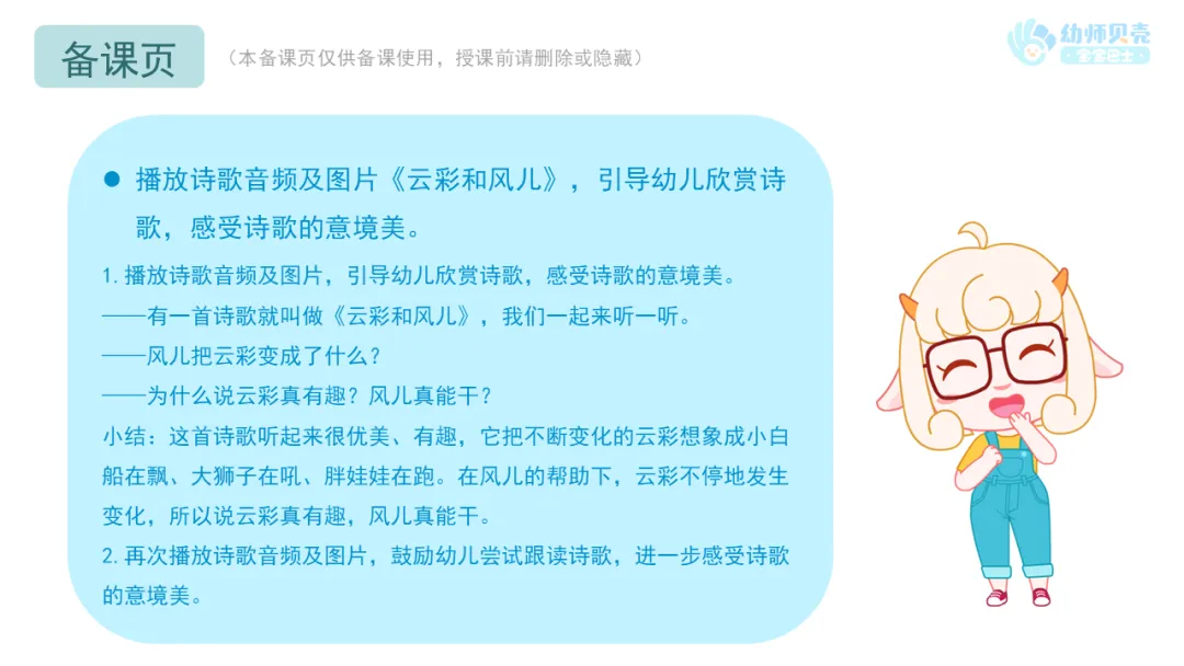 l播放诗歌音频及图片《云彩和风儿》,引导幼儿欣赏诗歌,感受诗歌的意境美。