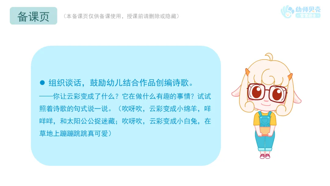 ——你让云彩变成了什么?它在做什么有趣的事情?试试照着诗歌的句式说一说。(吹呀吹,云彩变成小绵羊,咩咩咩,和太阳公公捉迷藏;吹呀吹,云彩变成小白兔,在草地上蹦蹦跳跳真可爱)