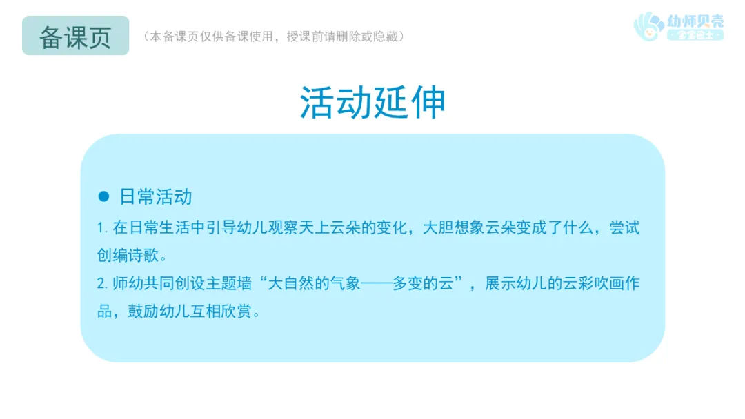 1.在日常生活中引导幼儿观察天上云朵的变化,大胆想象云朵变成了什么,尝试创编诗歌。