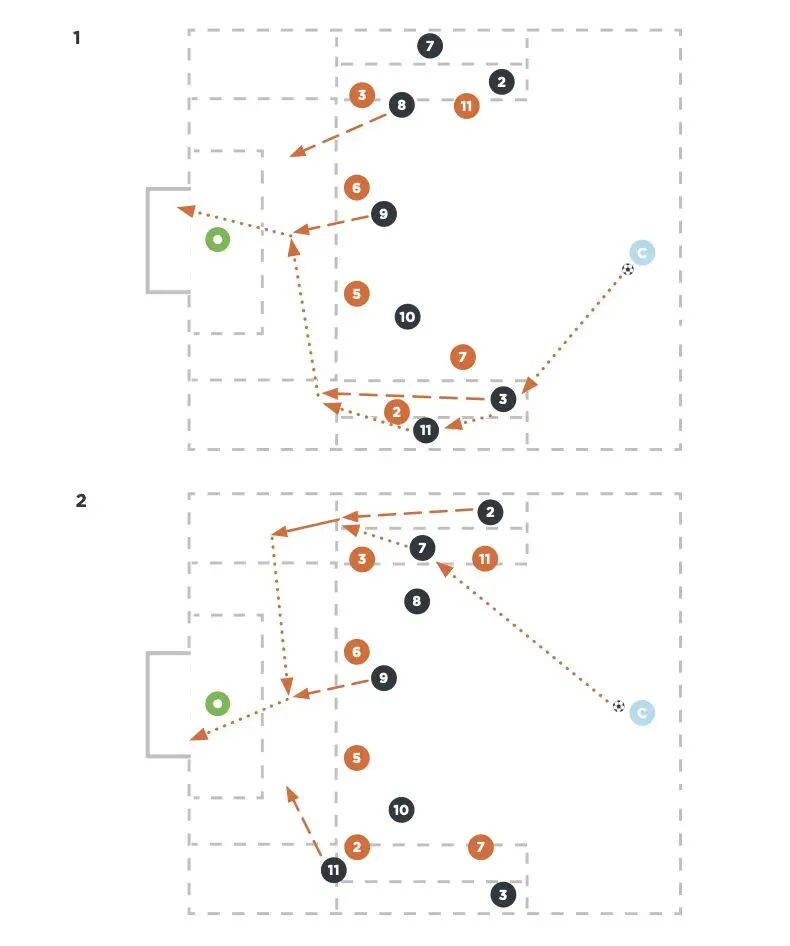 想象一下,在一小块12m×20m的场地内,边后卫与边锋搭档,面对两名防守球员。这里没有太多思考时间,一切靠本能和训练形成的肌肉记忆。