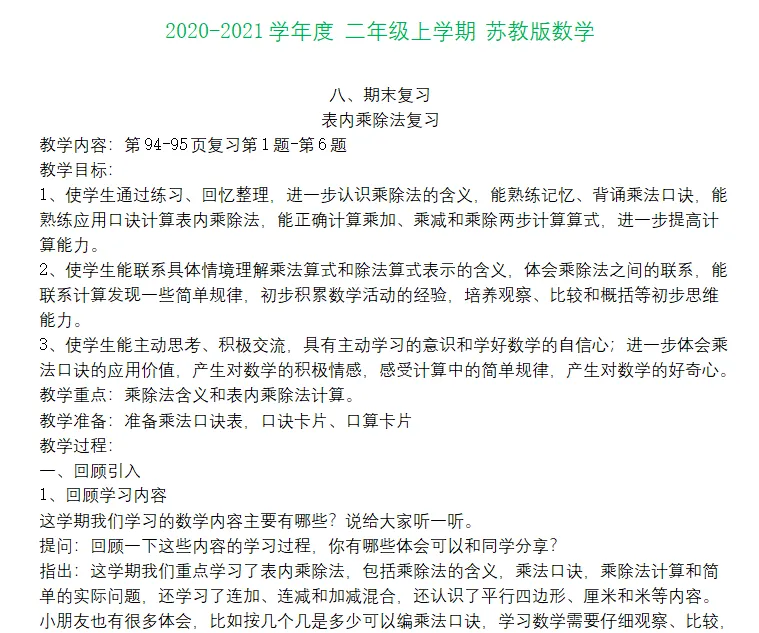 3、复习时,既要全面,又要突出重点。本学期的重点内容是100以内的笔算加法和减法,以及表内乘法,这些知识是进一步学习的基础,要使学生切实掌握好。“长度单位”、“平行四边形的初步认识”、“观察物体”等知识也是非常重要的,在复习过程中要给予足够的重视。