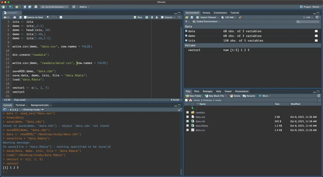 # RDS单对象saveRDS(demo,"data.rds")df_rds <- readRDS("data.rds")# RData可含多个对象save(data, demo, iris, file ="data.Rdata")load("data.Rdata")