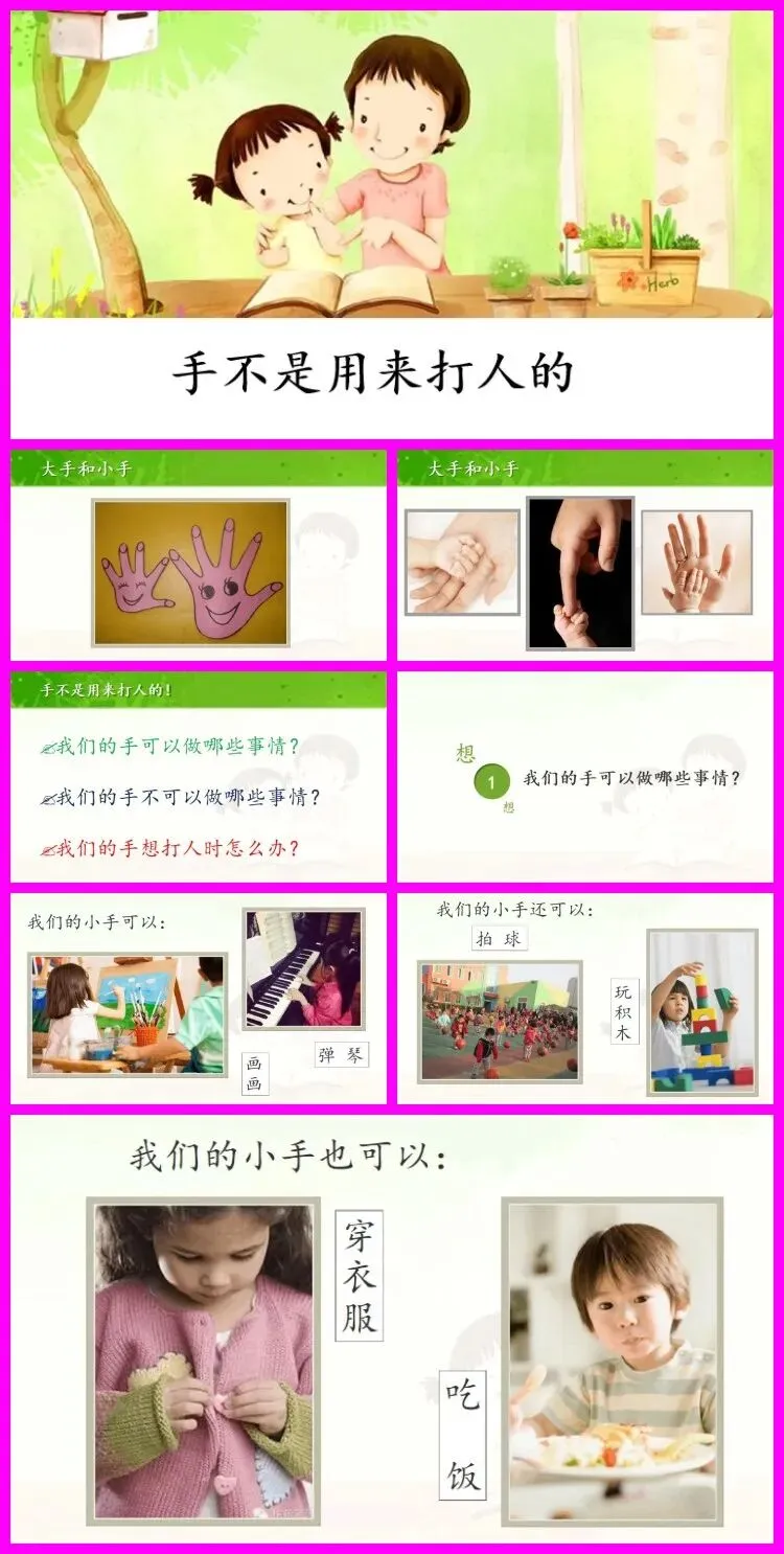在幼儿园的日常活动中,幼儿之间难免会出现争抢玩具、拉扯衣物甚至动手打人等行为。这是因为幼儿年龄较小,自我控制能力较弱,且尚未明确知道手的正确用途和不当行为带来的危害。《3-6岁儿童学习与发展指南》中指出,要帮助幼儿学会友好交往,懂得尊重他人,不侵犯别人的权利。基于此,结合PPT中“手的正确用途”“手的禁止行为”“想打人时的应对方法”等核心内容,设计本次社会活动。通过丰富有趣的互动、直观的图片展示,让幼儿清晰了解手的多种积极作用,明确不能用手做的伤害他人、影响他人的行为,学会控制自己的情绪和行为,养成友好交往、尊重他人的良好品质。