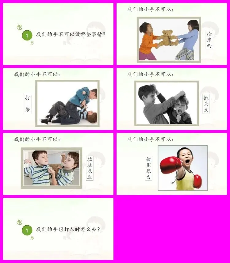 1.认知目标:知道手的多种正确用途,如画画、弹琴、拍球、玩积木、穿衣服、吃饭等;明确手不能用来打人、抢东西、揪头发、拉扯衣服、使用暴力等。