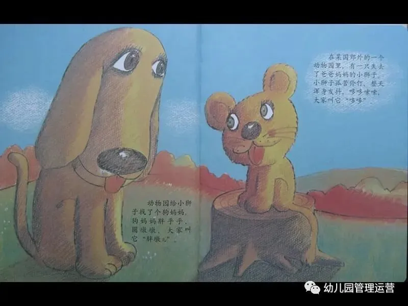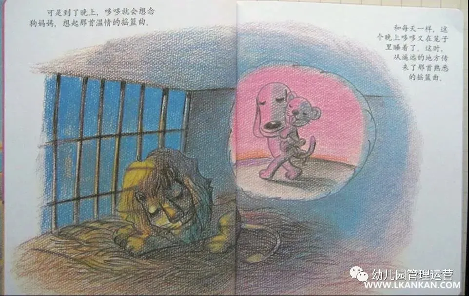 2.感受绘本的语言美,意境美,体会小狮子在各种环境下的心情。 (今天我们大二班来了这么多客人老师,跟后面的客人老师打个招呼吧——客人老师好!) 1.教师:小朋友,你们在什么时候会觉得自己很幸福呢? (爸爸妈妈给我买玩具,和爸爸妈妈一起到饭店吃饭……请2-3名幼儿回答) 2.幻灯片2:教师随即出示绘本中小狮子“哆哆”的形象幻灯片。 教师:(讲述故事)可是,在城外的动物园里有一只小狮子,它很小的时候就没有了爸爸妈妈,天冷了没有人给它穿衣服,饿了没有人给它饭吃,生病了也没有人照顾它,它整天浑身发抖,哆哆嗦嗦,大家都叫它“哆哆”。(这里可以用自己的语言,也可以直接用绘本里的语言。老师直接介绍两位主人翁,不要观察哆哆,以免图片特征不明显,幼儿说不出。) 教师:你们说哆哆可怜不可怜呀?(可怜)动物园工作人员看哆哆这么可怜,就给它找了个狗妈妈,仔细看一看狗妈妈长得什么样子?(头长长的,耳朵又大又长,眼睛大大的,身体胖胖的。幼儿自由说,无需请个别幼儿回答,老师一起回应、辅助,认识“胖墩儿”。) 教师小结:是的狗妈妈长的胖乎乎,圆墩墩,大家都叫它胖墩儿。 【设计意图:引导幼儿仔细观察图片,尝试用自己的语言讲述出狗妈妈和哆哆的不同形象,直接进入活动。】 二、观察图片,鼓励幼儿尝试运用语言、动作将图片内容表述出来,初步理解故事的内容,感受“哆哆”的心情。 教师:(继续讲故事)这只善良的狗妈妈看到哆哆,就决定要好好的照顾它,想一想,猜一猜狗妈妈会怎样照顾“哆哆”呢? 幼儿:给它吃东西,买衣服,带它出去玩,生病的时候陪在它身边……(看幼儿举手情况,快速请3-4名幼儿回答,并简单回应。比如——很好的主意;嗯,有可能等) 过渡:你们想得真棒,真是有爱心的小宝贝,狗妈妈到底是怎样照顾小“哆哆”的呢?我们一起来看看。 教师:这里四幅画,请你看一看,想一想,说一说,你看到了什么?这些你刚才都想到了吗?(吃饭、握手、拥抱、游戏) (在喂哆哆吃东西,在亲亲它抱抱它,在做游戏:你能上来指一指是哪一幅图吗?他们在玩什么游戏呀?我来做狗妈妈我们也来玩一玩。)还有一幅图在干什么呀?(握握手)我做胖墩妈妈,你做哆哆宝贝,我们来握握手。 (亲亲、抱抱的时候老师可以拥抱一两个幼儿,并说“来,抱一抱,你们都是我的乖宝宝”。) (握手的时候,老师可以和再多一点的小朋友握手,快速开火车。说上面那段话——我做胖墩妈妈,你做哆哆宝贝,我们来握握手,妈妈好爱宝宝。) 教师:狗妈妈为了照顾我们的小“哆哆”,给了它很多很多的爱,在“哆哆”睡觉的时候,狗妈妈也为“哆哆”唱起温柔的摇篮曲。跟着“哆哆”,我们一起来听一听。 ——小哆哆乖宝宝,宝宝快睡觉,好好睡觉睡好觉,宝宝要喝奶,好好喝奶喝好奶,小哆哆乖宝宝,宝宝睡觉啦! 教师:哆哆听着妈妈的摇篮曲,闭上眼睛,美美的睡着了。我们一起来学狗妈妈哄哆哆睡觉的样子,唱唱摇篮曲吧。靠近的小朋友一个做狗妈妈一个做哆哆,妈妈把哆哆抱在怀里准备好了。(这一遍,老师念儿歌,幼儿个别能跟着念的也不反对,营造一种轻松,温馨的氛围。) 教师:是的。哆哆现在的生活很甜蜜,它觉得自己很幸福。在狗妈妈的精心抚养下,小哆哆变得很温顺,它一天天长大,长得比狗妈妈还大呢! (就用绘本中的语言,让幼儿静静地倾听和感受,不需要提问!) 教师:故事讲到这儿,顾老师有一个问题想问问小朋友了。狗妈妈为培养哆哆,完全把哆哆当成了自己的孩子,付出了自己全部的爱。那你觉得这是一位怎样的妈妈呢? 教师:哆哆长大了,狗妈妈变老了,哆哆和妈妈之间的感情怎么样? (它们都很爱对方,不想离开对方,和妈妈在一起是一件非常幸福的事情。) 教师:(继续讲故事)可是有一天,哆哆被送到城里的动物园去,在山村的路口,狗妈妈和哆哆要分别了。从此以后,哆哆和狗妈妈再也不能见面了,狗妈妈一个人孤零零的呆在山坡上,看着哆哆越走越远,留下了伤心的眼泪。 好几年过去了,狮子哆哆现在是马戏团的大明星了。虽然哆哆白天很快乐,可是到了晚上,哆哆就会想念狗妈妈。 教师:哆哆会想念妈妈的什么呢?(提问幼儿:摇篮曲,和妈妈在一起的快乐时光。) 教师小结:是的,哆哆会想念妈妈,想念妈妈温暖的怀抱,想起那首温情的摇篮曲。 继续故事:和每天一样,这个晚上哆哆又在思念中睡着了。这时在遥远的地方传来了那首熟悉的摇篮曲——小哆哆乖宝宝,宝宝快睡觉,好好睡觉睡好觉,宝宝要喝奶,好好喝奶喝好奶,小哆哆乖宝宝,宝宝睡觉啦!是妈妈!哆哆好像听见妈妈的呼唤:哆哆,我的孩子,你在哪儿呀?(这一段应该还停留在幻灯片9) 教师:哆哆是如此地想念狗妈妈,你们猜猜看,它会怎么做呢? 幼儿:用爪子把笼子挖一个洞,把笼子摇开,用头顶。(请几个幼儿回答) 教师:你们帮哆哆想了这么多办法,这是需要很大的力气和勇气的。 继续故事:于是,哆哆使出浑身的力气,撞坏笼子冲了出去。它迫切地想要见到狗妈妈,它一边跑一边喊着:妈妈你在哪,妈妈我来啦!哆哆如同金色的风,如同发光的箭,它的鬃毛迎风飘扬。越跑越快!我们一起来给哆哆加油:哆哆加油。听到我们的加油声,哆哆跑得更快了。 继续故事:哆哆穿过大街,穿过小巷,穿过楼房,城里的人惊呆了,从墙里蹿出来一头狮子。这时候城里一片混乱,端着来复枪的警察在追赶狮子,想把哆哆送回马戏团。 继续故事:尽管哆哆遇到了很多困