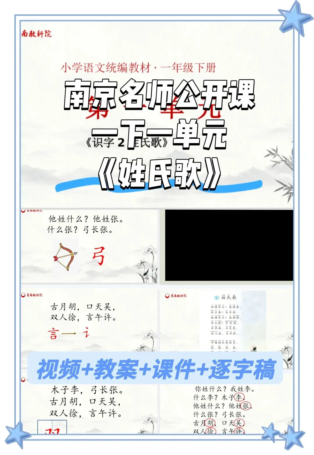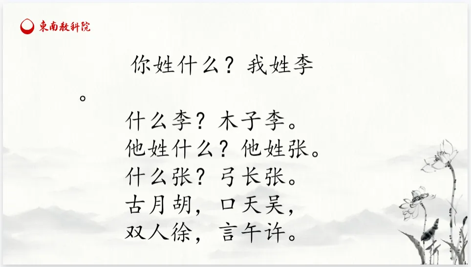 3.学习用普通话正确、流利地朗读儿歌、背诵儿歌。学会用“分解部件”、“说偏旁”的方法介绍自己的姓氏,感受中国姓氏的多样。