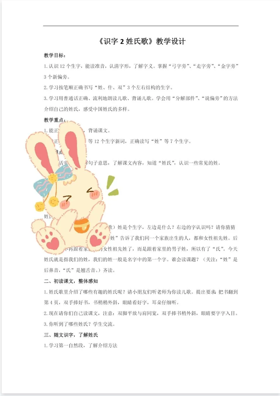结合生活实际,了解句子意思,了解课文内容,知道“姓氏”,认识一些常见的姓。