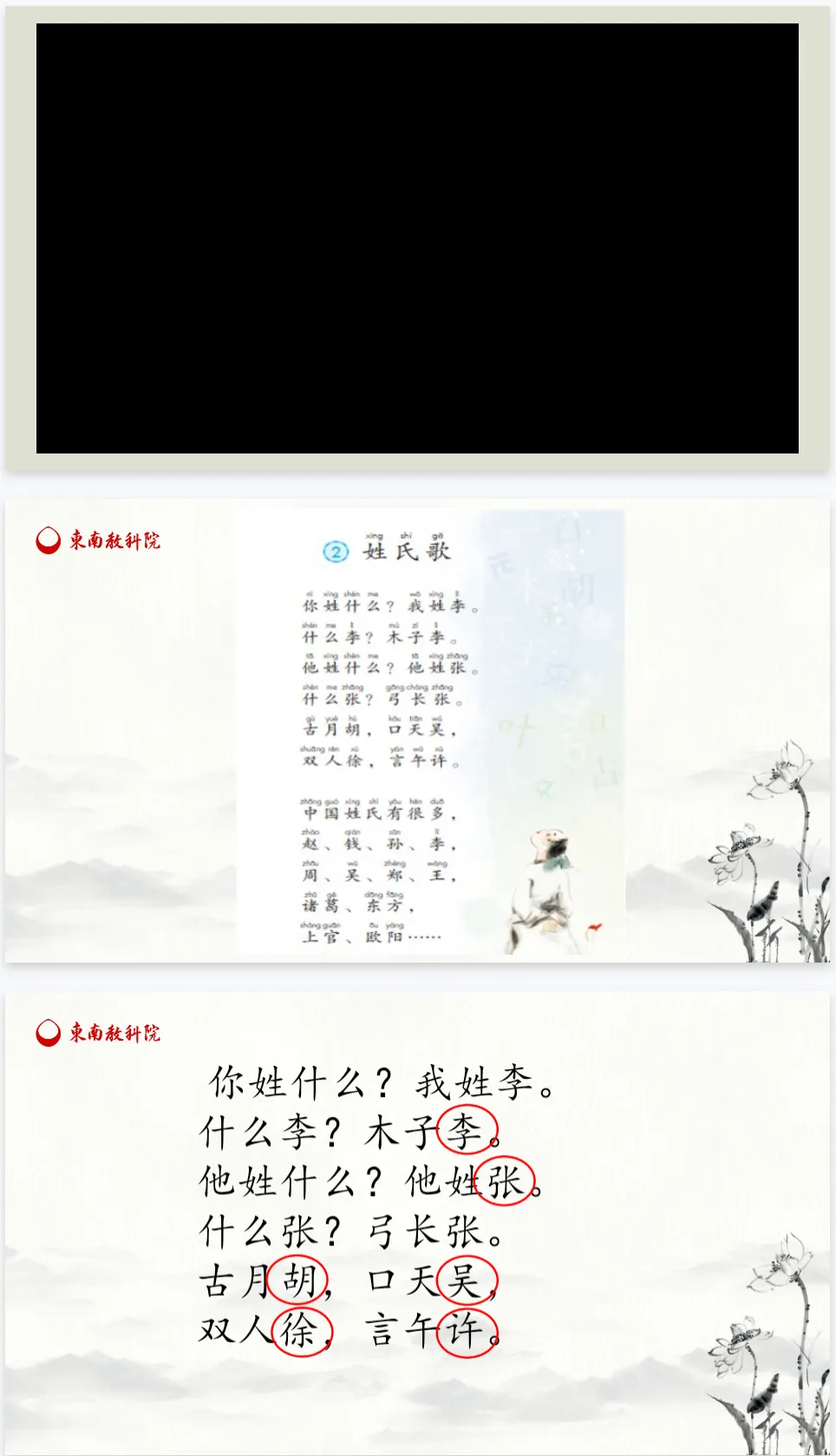 1.(播放视频《百家姓儿歌》)小朋友们,我们来听听这首小儿歌里唱了些什么?指名说。