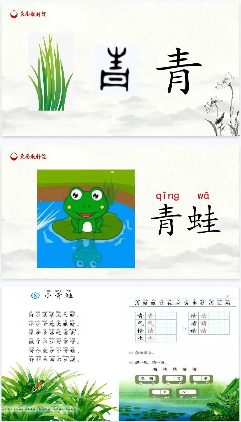 2.教学生字“青”(图、古文字),就像小草向上生长的样子,原来就是指小草的颜色。
