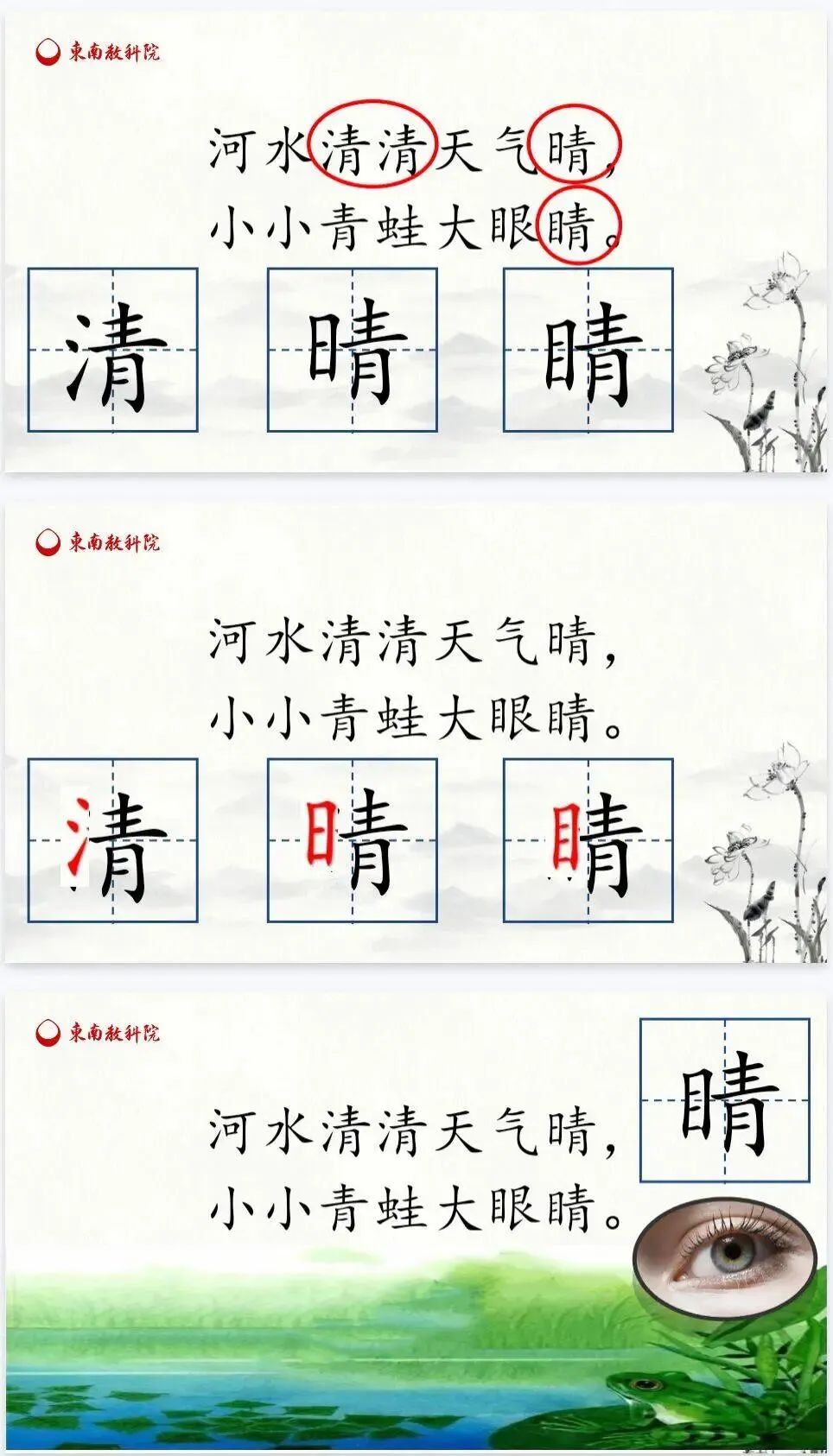 3.出示“清 晴 睛”看看这些字都是由谁和“青”交朋友组成的?你能把它们变出来吗?(请学生上台加偏旁)。
