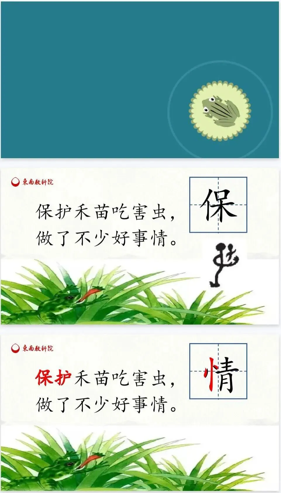 8.小青蛙是怎么做的呢?(播放视频青蛙吃害虫。)“保”字的古文字是 ,一个大人手里抱着婴儿,好好地保护他,养育他。