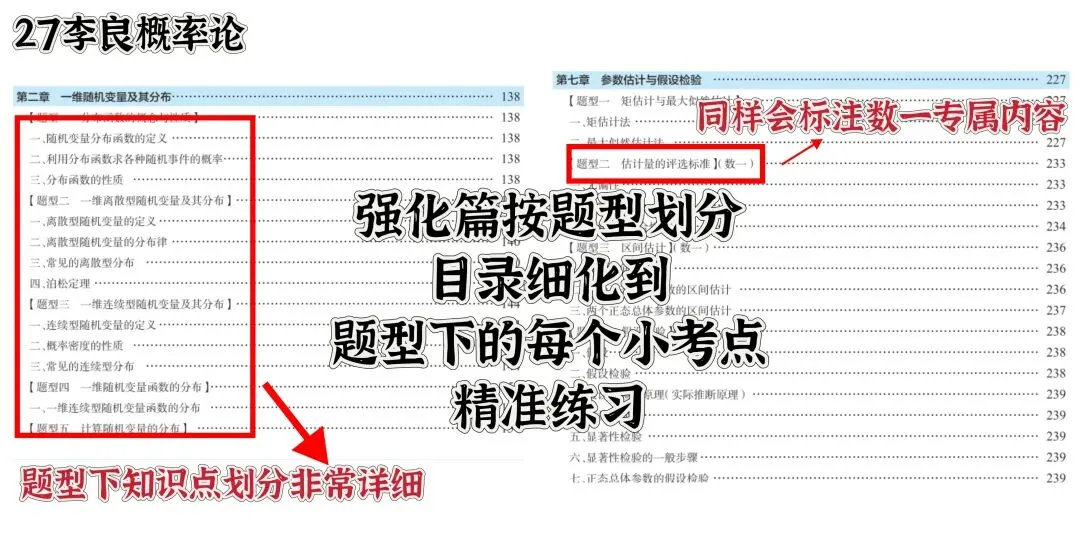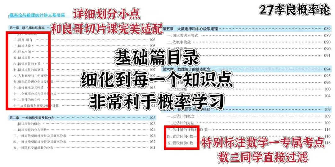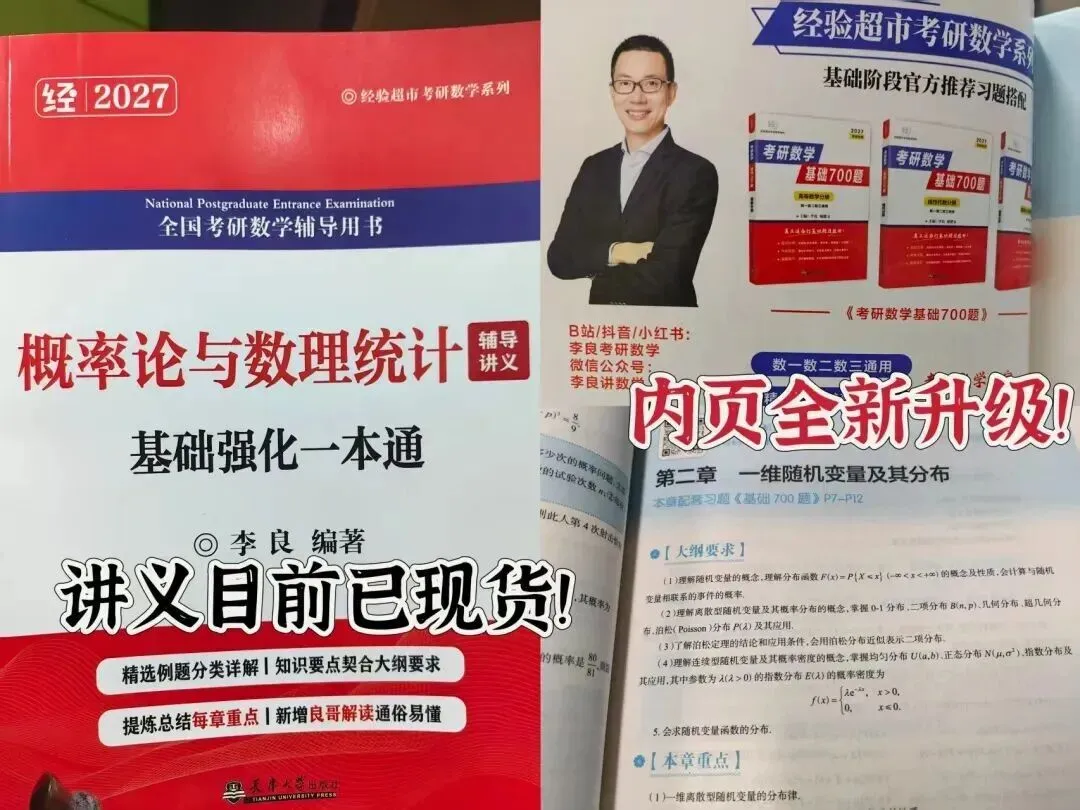 目前,我的2027版《概率论与梳理统计辅导讲义基础强化一本通》已经全新现货上市,当天发货。这本书,良哥一直是抱着能够带大家从概率论入门到精通的心态来编写的,也结合概率本身的特点不断调整内容编排和题目练习。今年咱们的讲义主要有以下几个优点: