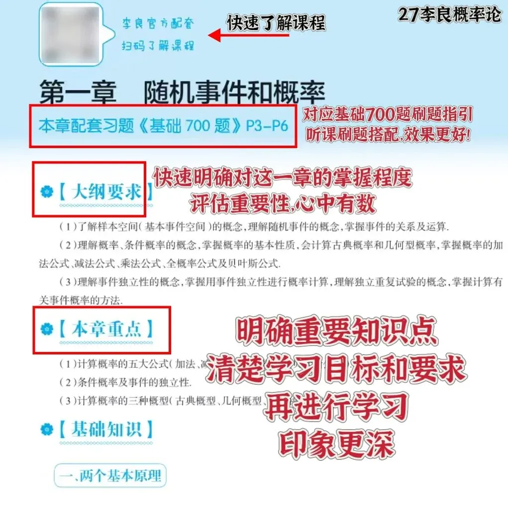 同时,结合去年同学们学习概率的反馈“概率论基础轮复习不知道写什么练习题”,其实《基础700题》概率论分册就是最合适的练习题,因此,今年我们在讲义上新增了每章知识点学完后,要对应去刷基础700题的对应页码,听课刷题搭配,效果更好!