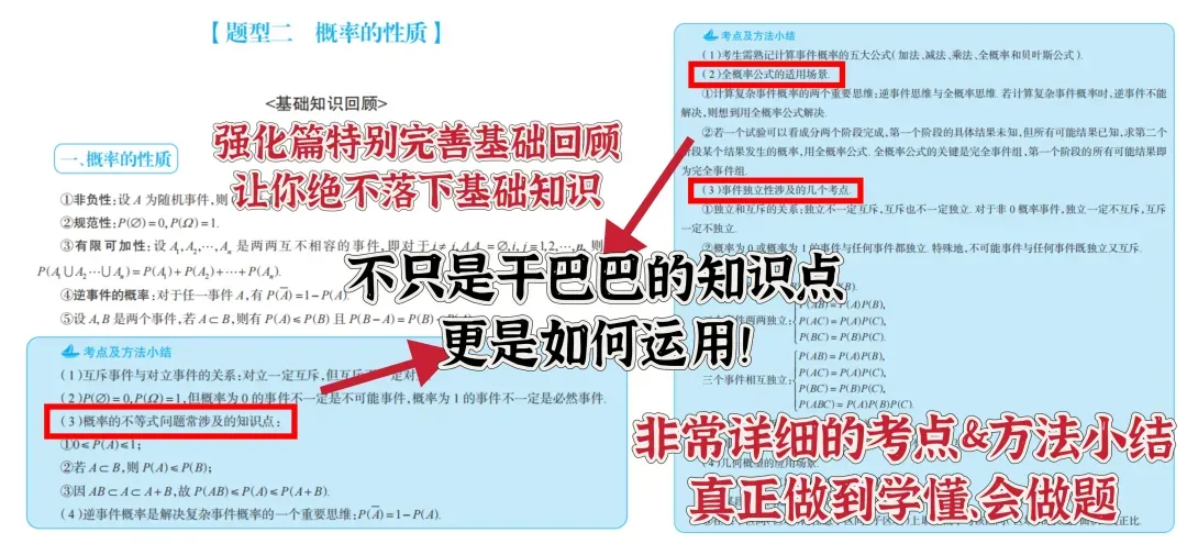 (3)强化篇主要以“概率论与数理统计”考察的典型题型为主线编写。首先是对每章的基础知识进行回顾,然后是一些强化难度的例题及对例题的解析。每章结尾都有一个考点及方法小结,这部分也希望同学们学到后期了然于心。并且27版的概率论强化篇我们提升了例题的难度,以迎合考研概率论的趋势。