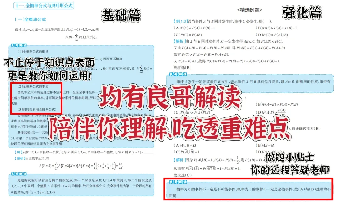 (1)基础强化一本书搞定。本书分基础篇和强化篇,基础篇按知识点索引,强化篇按题型索引。概率论的知识点相对高数更少,良哥觉得一本书给大家讲透知识点、教会大家做题完全足够,也避免同学们买书上的麻烦!