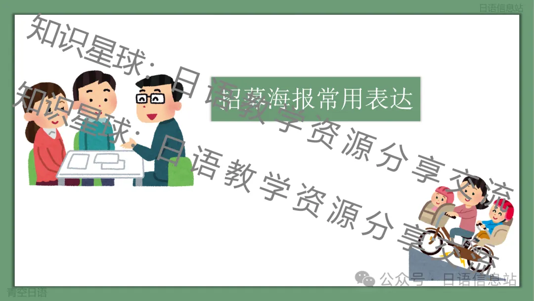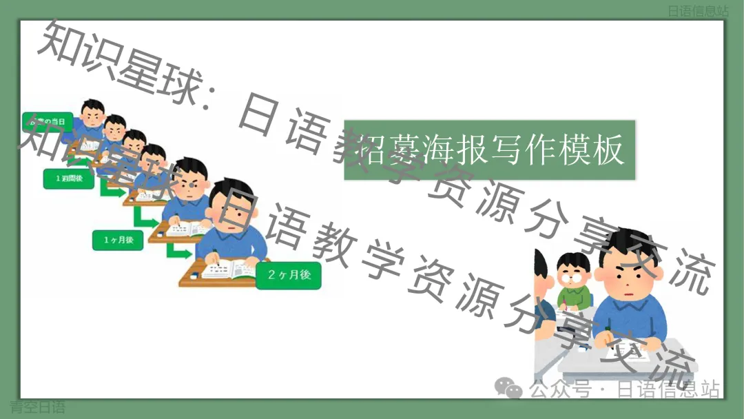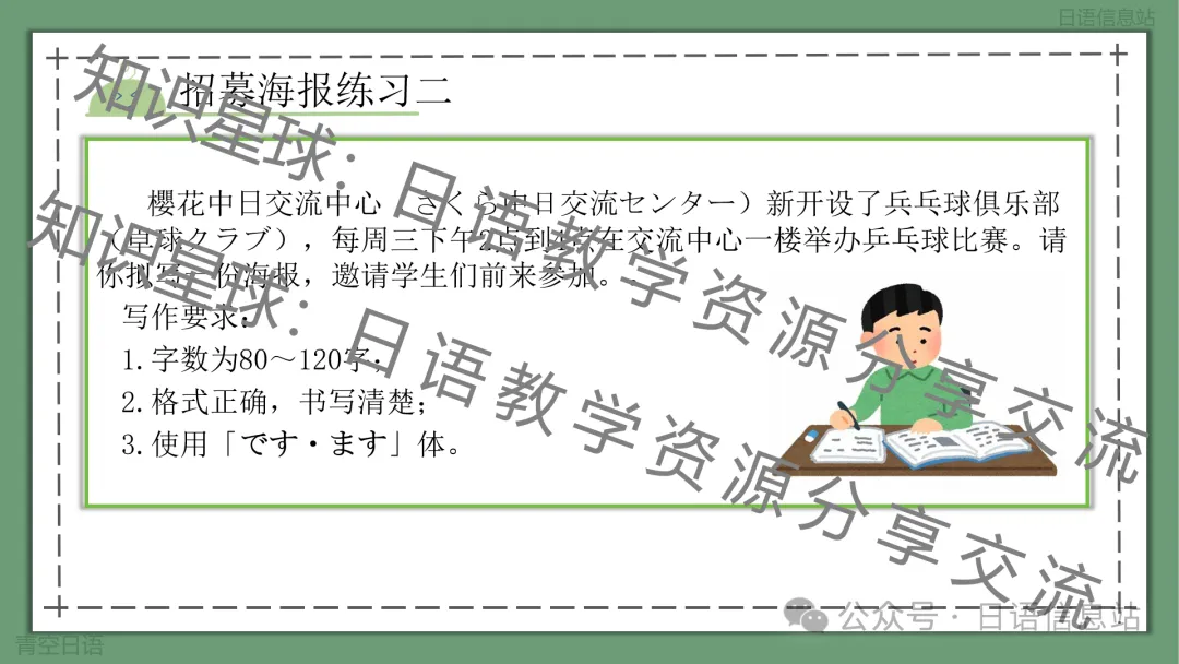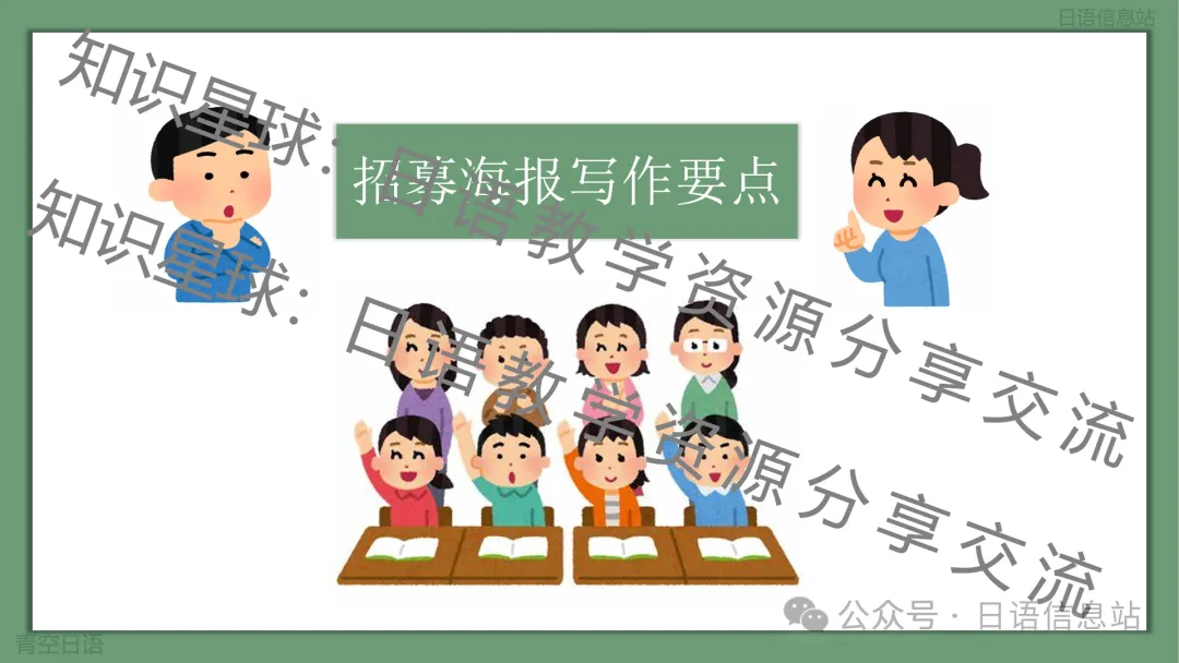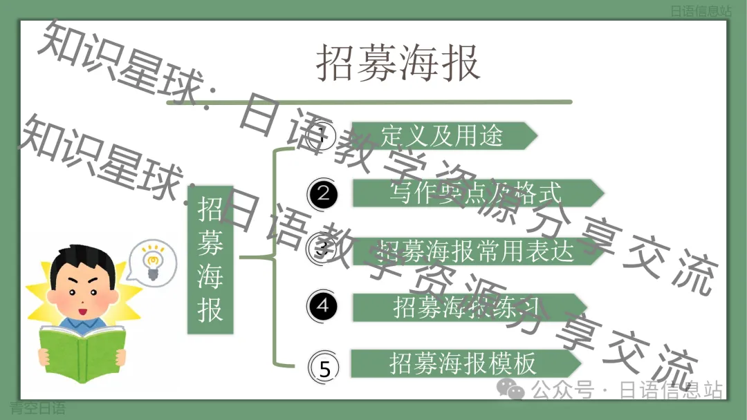 此课件为通知作文的其中一个类型,主题为招募海报。应用文类型很多,很多其他类型的课件已经上传至知识星球:日语教学资源分享与交流。这个课件主要围绕:招募海报的定义、招募海报写作要点、写作格式要求、常用表达、招募海报写作练习以及写作模板这几个方面展开。应用文写作有很多固定模式,掌握了其中的写作模式、写作格式,以及积累一些常用表达之后,就会很轻松写出一篇好作文。此课件也是主要围绕如何让学生学会写招募海报进行讲解。最后给出模版几乎可以直接套用即可。