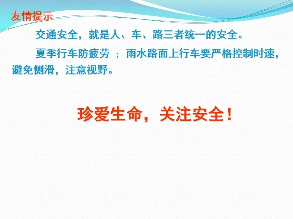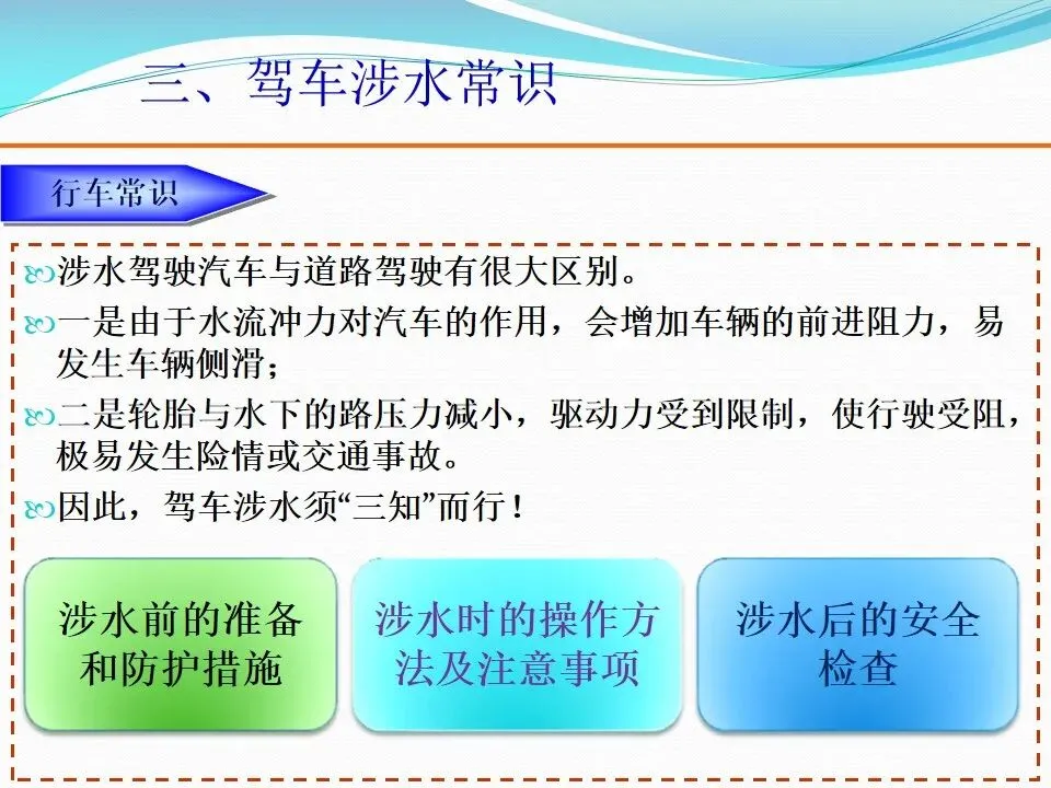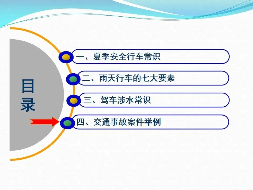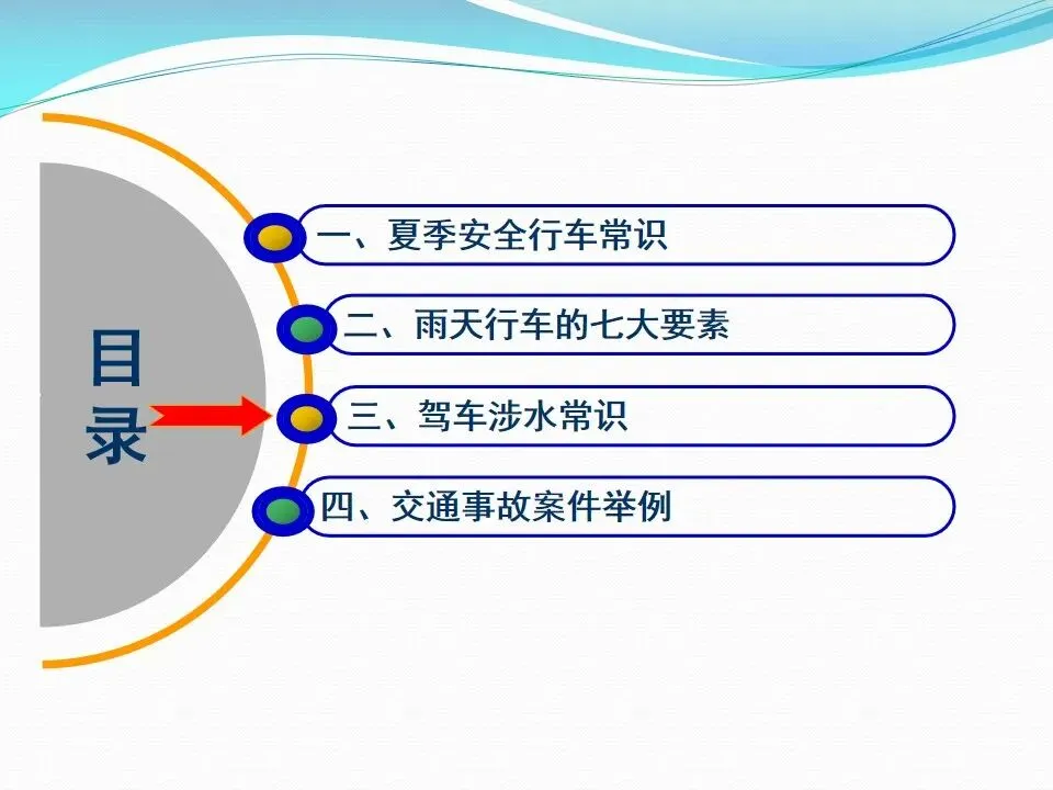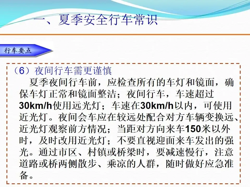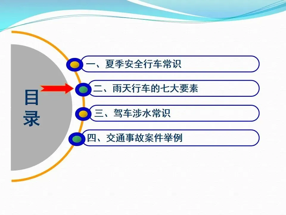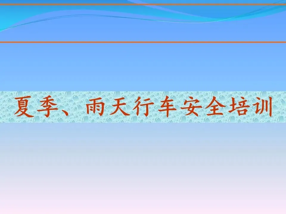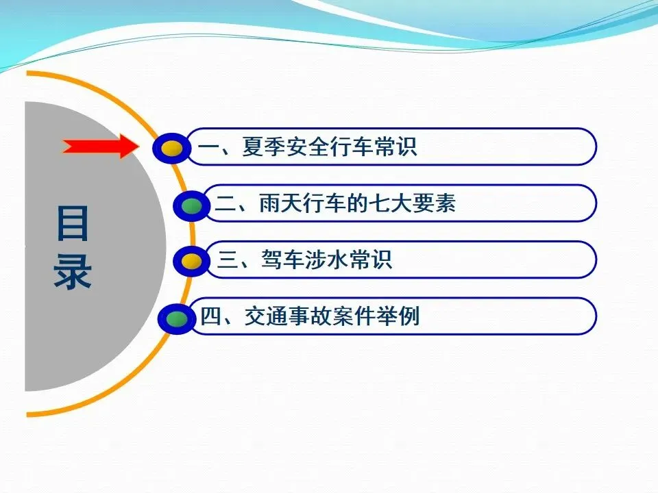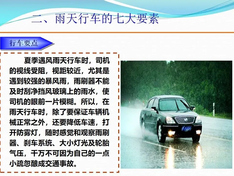 夏季雨天行车风险叠加,课件围绕“人、车、路”安全链展开。先讲高温季节检查轮胎、水温、制动,杜绝疲劳驾驶与酒后驾驶,再列雨天七大要素:开灯控速、防侧滑、涉水先测深、拒急刹、避行人、陷车自救。涉水篇给出“三知”原则,标注轿车40厘米极限,教包扎线口、挂低挡、一气呵成。尾段剖析两起典型,灯光不全误撞拖拉机,雾天疲劳追尾致死,强调灯光完好、连续驾驶不过四小时、会车提防“独眼车”。全篇用血的案例警示,把技术操作、法规责任、生理极限讲透,为夏季雨季安全驾驶提供系统盾牌。