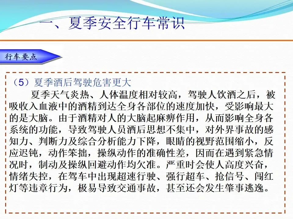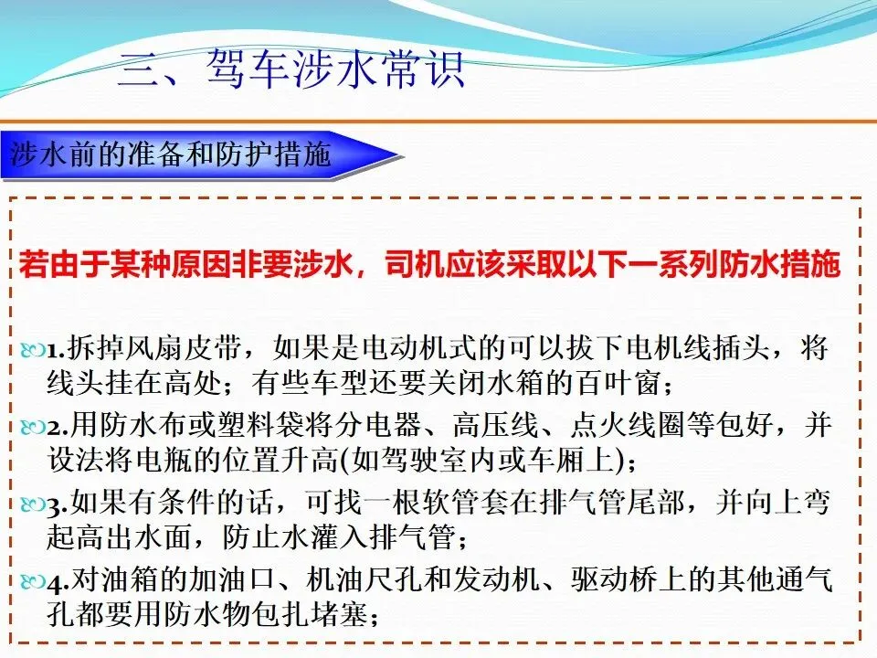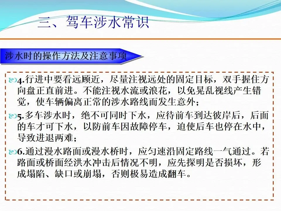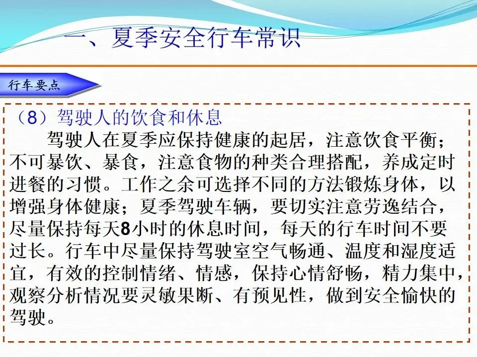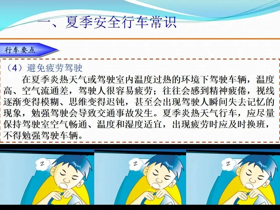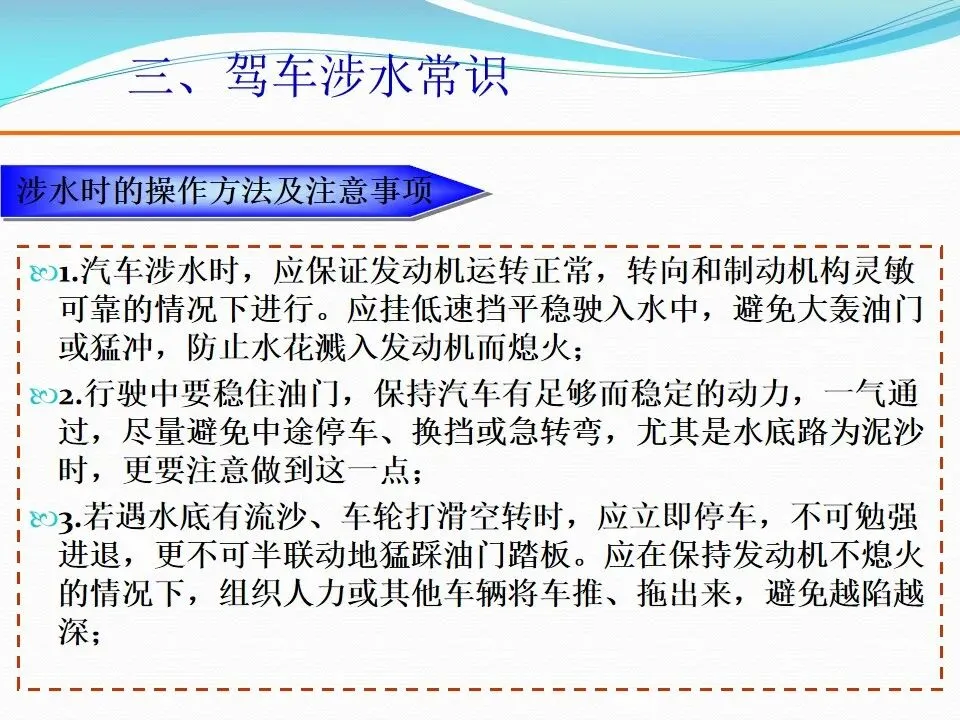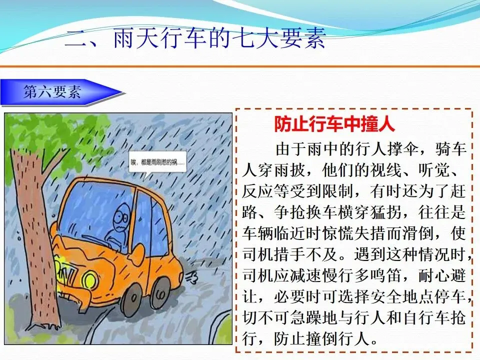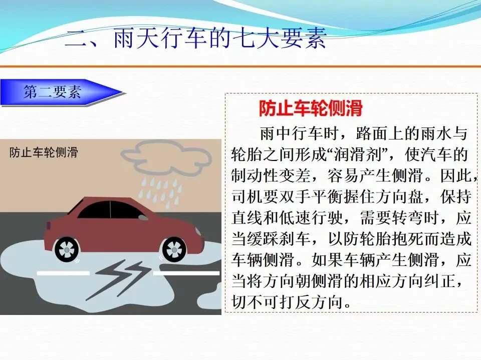 夏季雨天行车风险叠加,课件围绕“人、车、路”安全链展开。先讲高温季节检查轮胎、水温、制动,杜绝疲劳驾驶与酒后驾驶,再列雨天七大要素:开灯控速、防侧滑、涉水先测深、拒急刹、避行人、陷车自救。涉水篇给出“三知”原则,标注轿车40厘米极限,教包扎线口、挂低挡、一气呵成。尾段剖析两起典型,灯光不全误撞拖拉机,雾天疲劳追尾致死,强调灯光完好、连续驾驶不过四小时、会车提防“独眼车”。全篇用血的案例警示,把技术操作、法规责任、生理极限讲透,为夏季雨季安全驾驶提供系统盾牌。