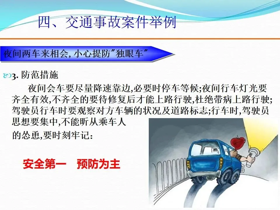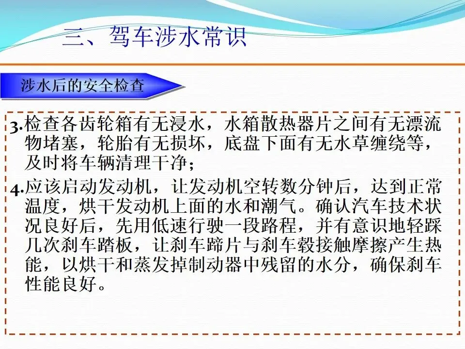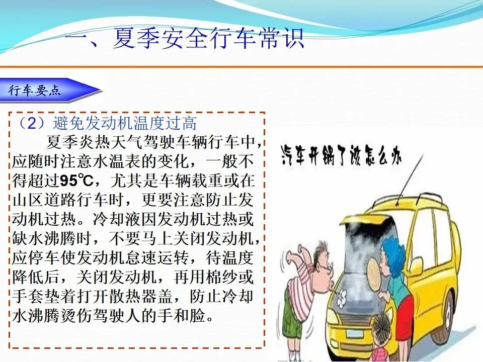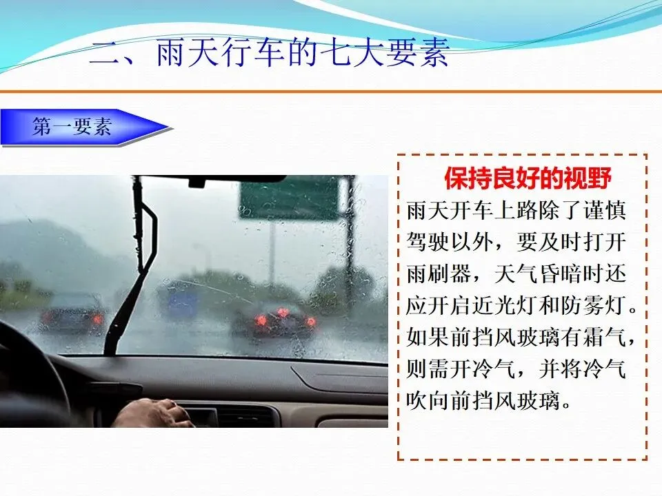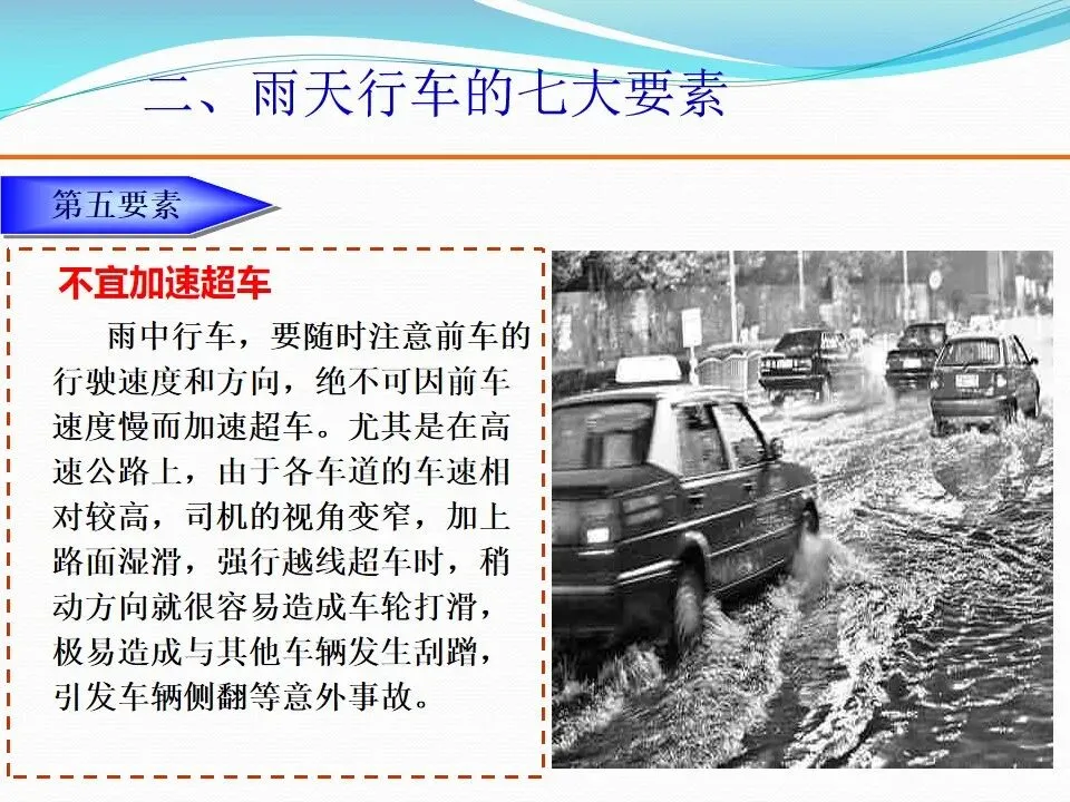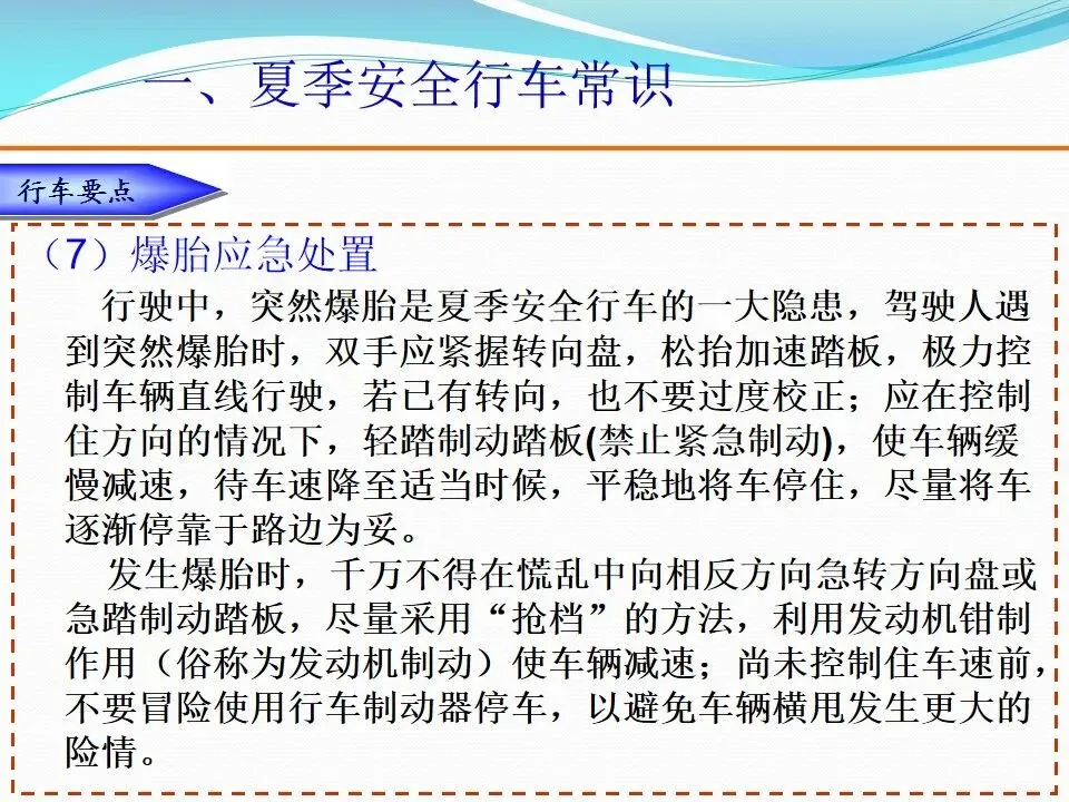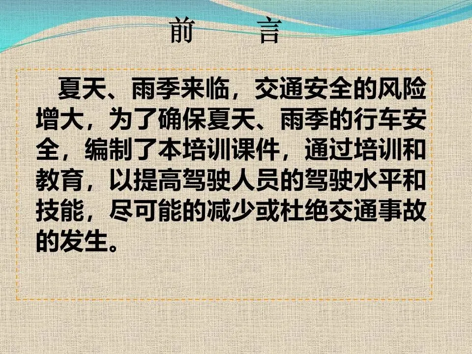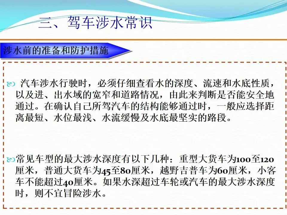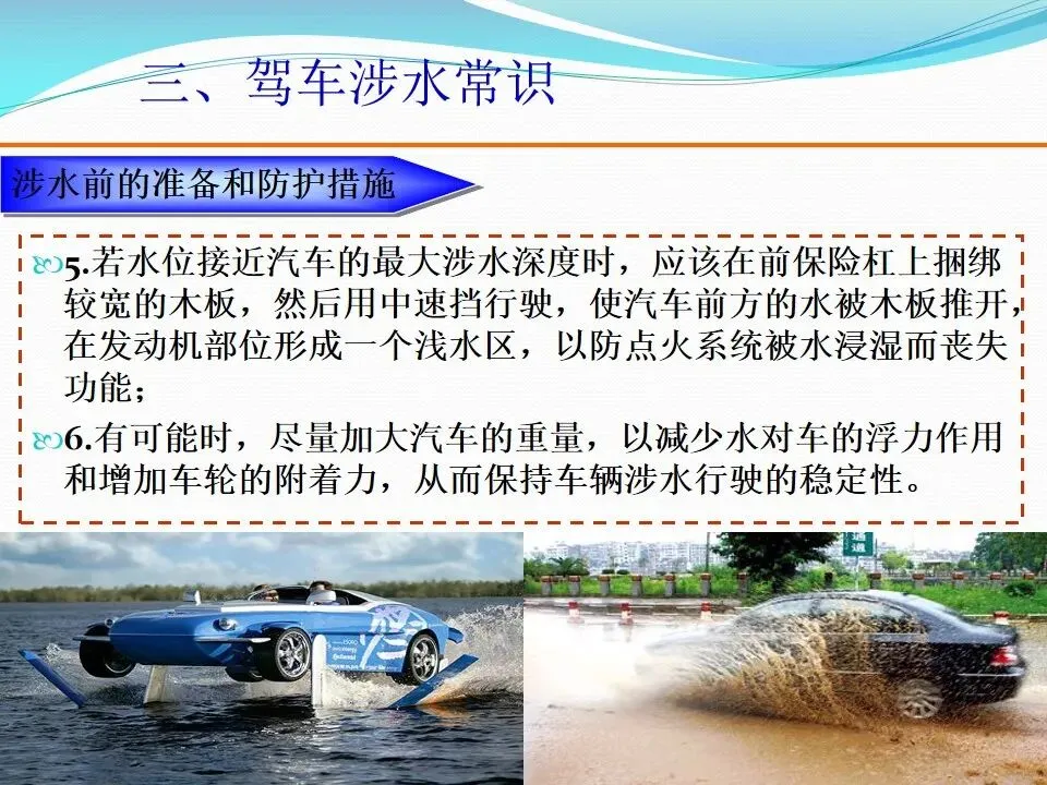 夏季雨天行车风险叠加,课件围绕“人、车、路”安全链展开。先讲高温季节检查轮胎、水温、制动,杜绝疲劳驾驶与酒后驾驶,再列雨天七大要素:开灯控速、防侧滑、涉水先测深、拒急刹、避行人、陷车自救。涉水篇给出“三知”原则,标注轿车40厘米极限,教包扎线口、挂低挡、一气呵成。尾段剖析两起典型,灯光不全误撞拖拉机,雾天疲劳追尾致死,强调灯光完好、连续驾驶不过四小时、会车提防“独眼车”。全篇用血的案例警示,把技术操作、法规责任、生理极限讲透,为夏季雨季安全驾驶提供系统盾牌。