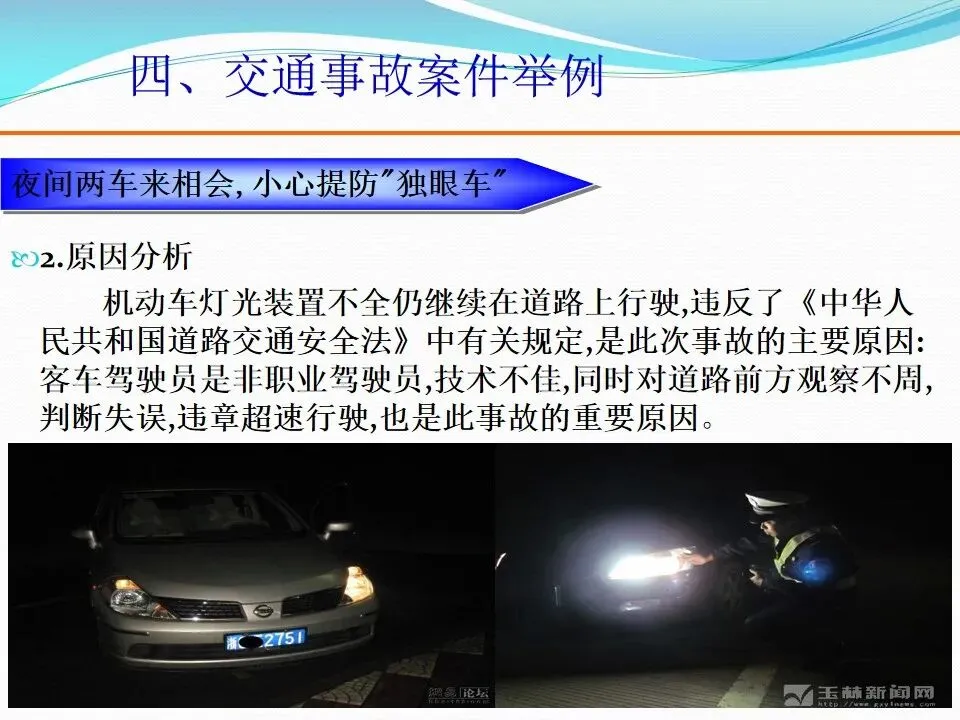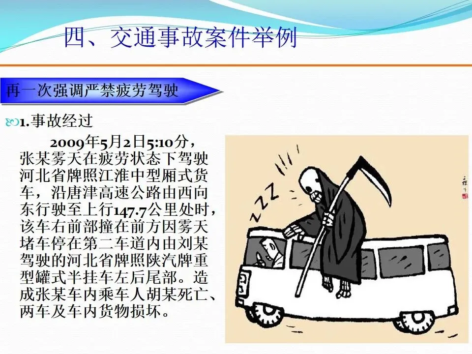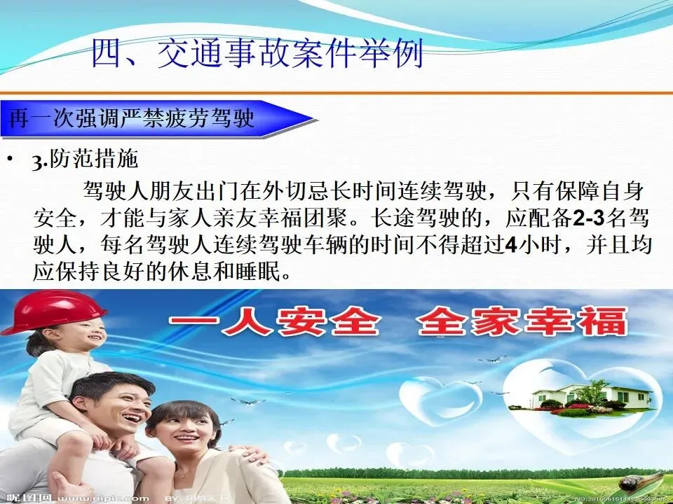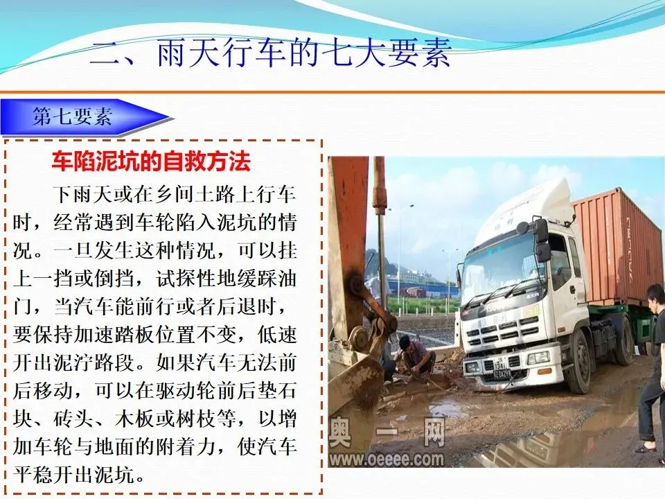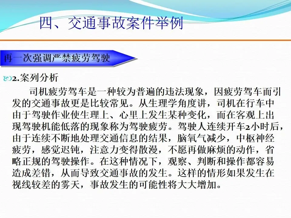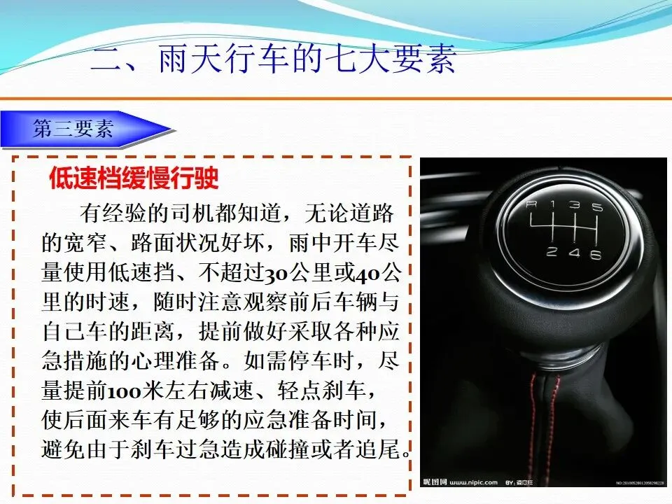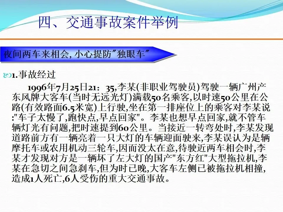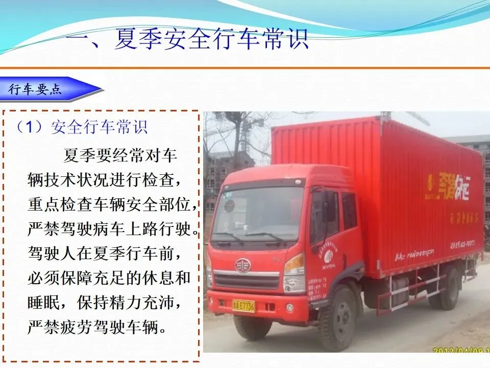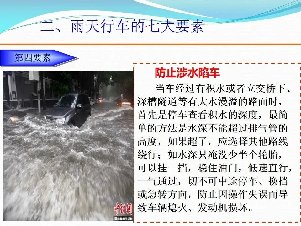 夏季雨天行车风险叠加,课件围绕“人、车、路”安全链展开。先讲高温季节检查轮胎、水温、制动,杜绝疲劳驾驶与酒后驾驶,再列雨天七大要素:开灯控速、防侧滑、涉水先测深、拒急刹、避行人、陷车自救。涉水篇给出“三知”原则,标注轿车40厘米极限,教包扎线口、挂低挡、一气呵成。尾段剖析两起典型,灯光不全误撞拖拉机,雾天疲劳追尾致死,强调灯光完好、连续驾驶不过四小时、会车提防“独眼车”。全篇用血的案例警示,把技术操作、法规责任、生理极限讲透,为夏季雨季安全驾驶提供系统盾牌。