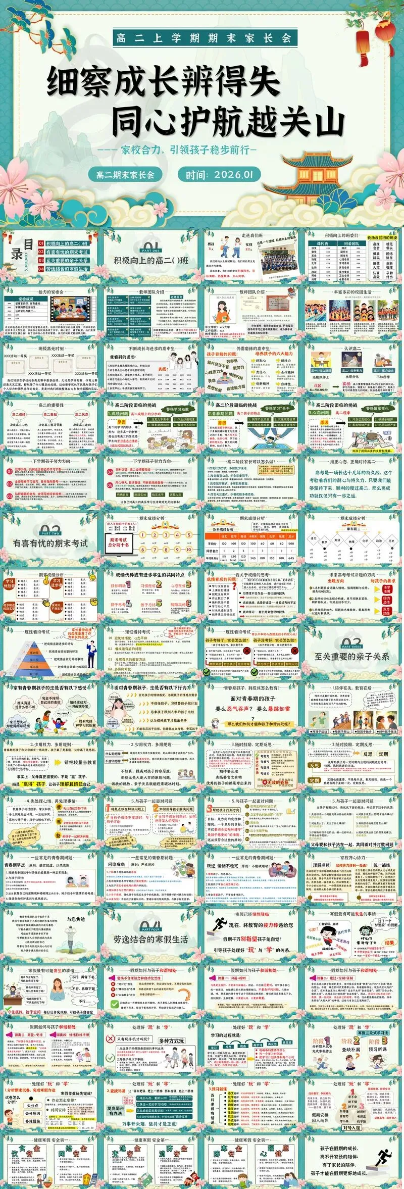 高二是高中阶段分化与定型的关键期!这份《高二期末家长会PPT》以“分析现状、疏导心理、规划寒假、面向高考”为主线,为高中教师提供了一份紧扣学情、内容扎实、便于操作的家校沟通方案。