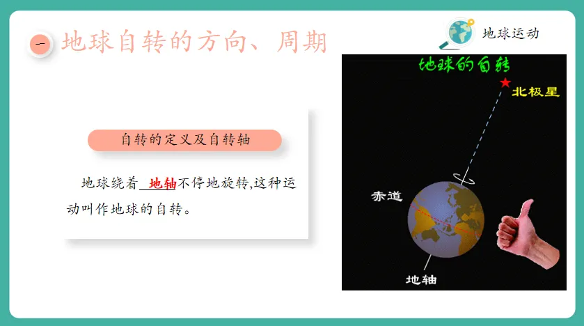 思考:什么叫做地球的自转?地球是绕什么在不停地自转?地球自转的方向怎样?