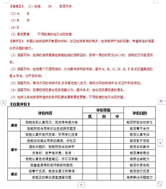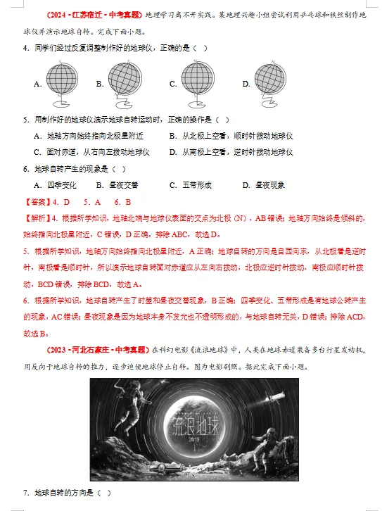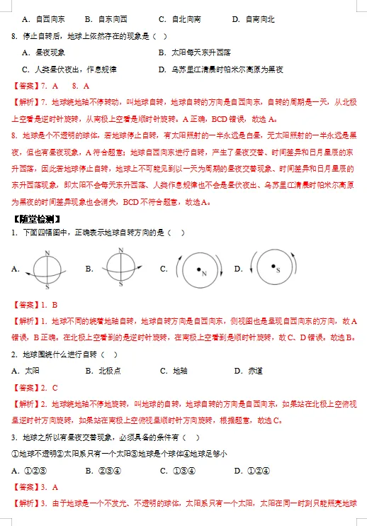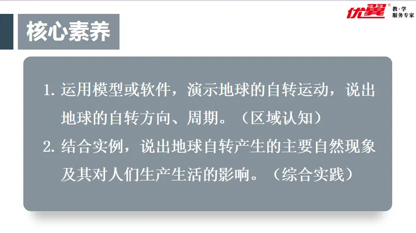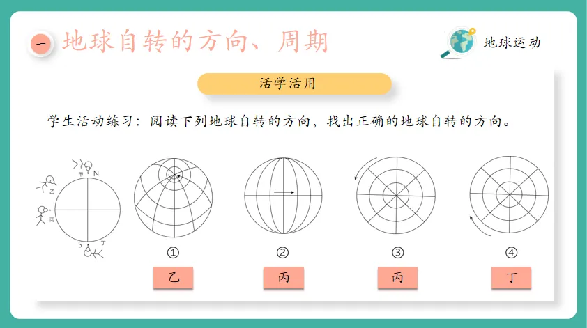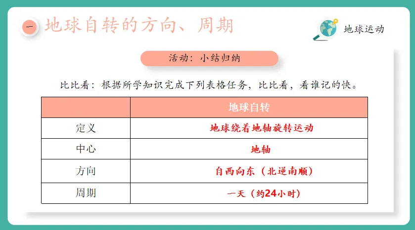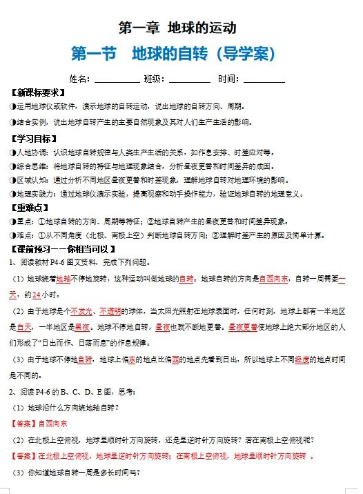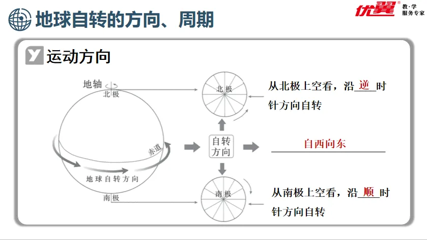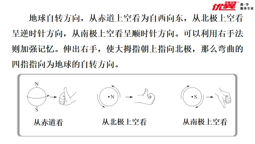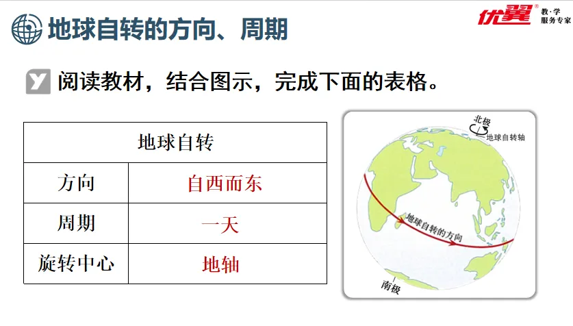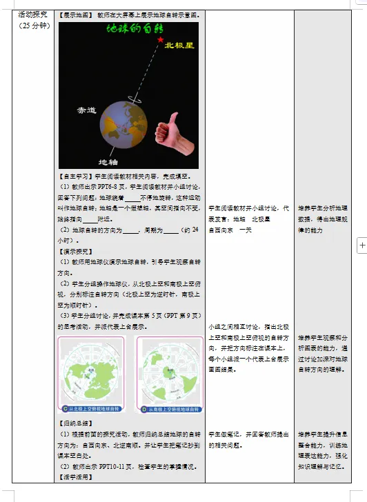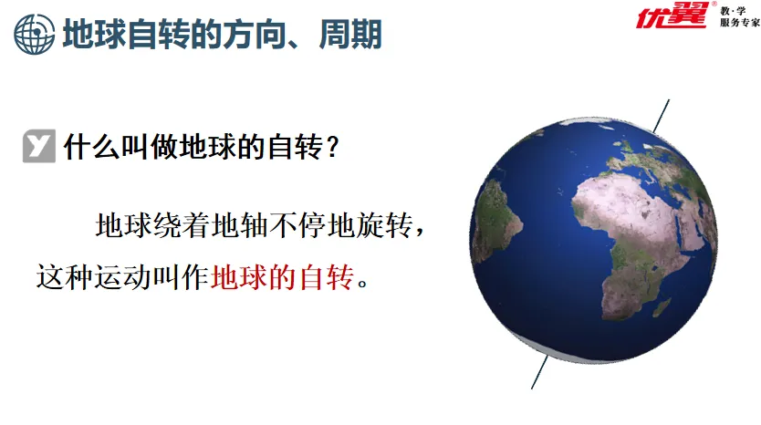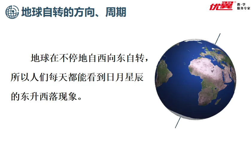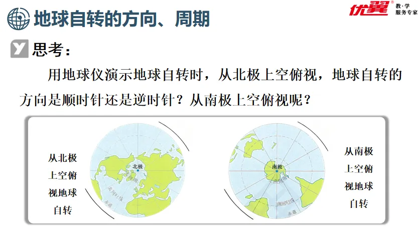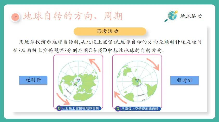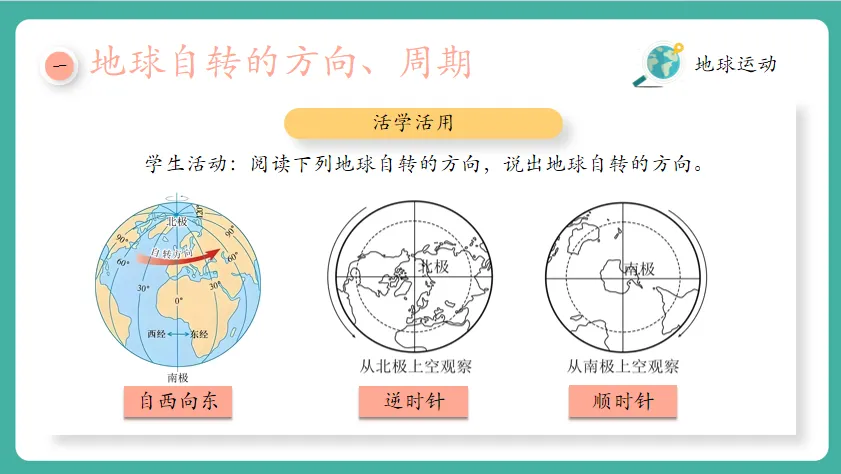 1.运用模型或软件,演示地球的自转运动,说出地球的自转方向、周期。(区