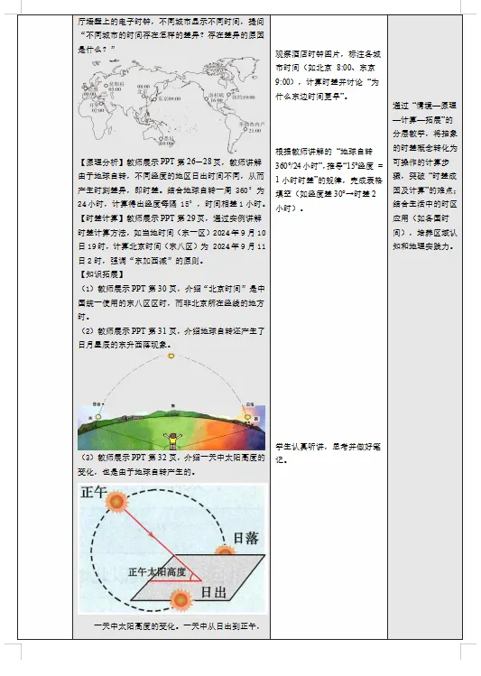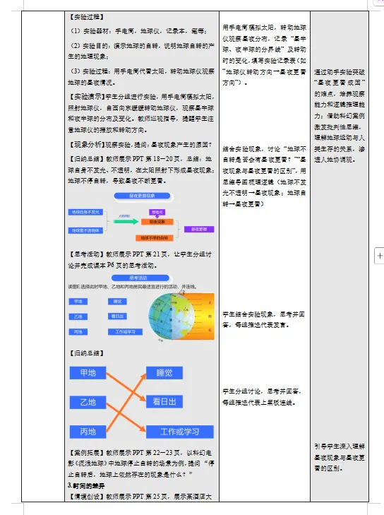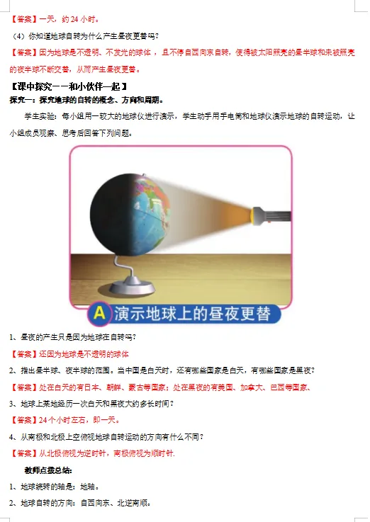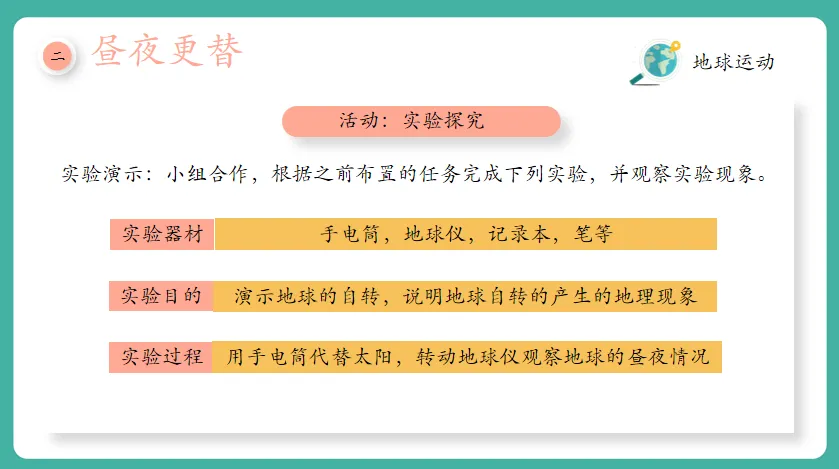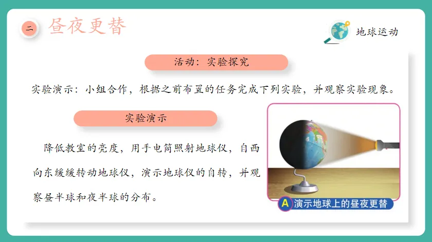 演示:教师用手电筒照射地球仪,演示昼夜的产生,并讲解产生的原因;然后再转动地球仪,演示昼夜更替,并讲解产生的原因。