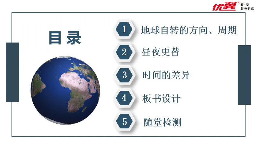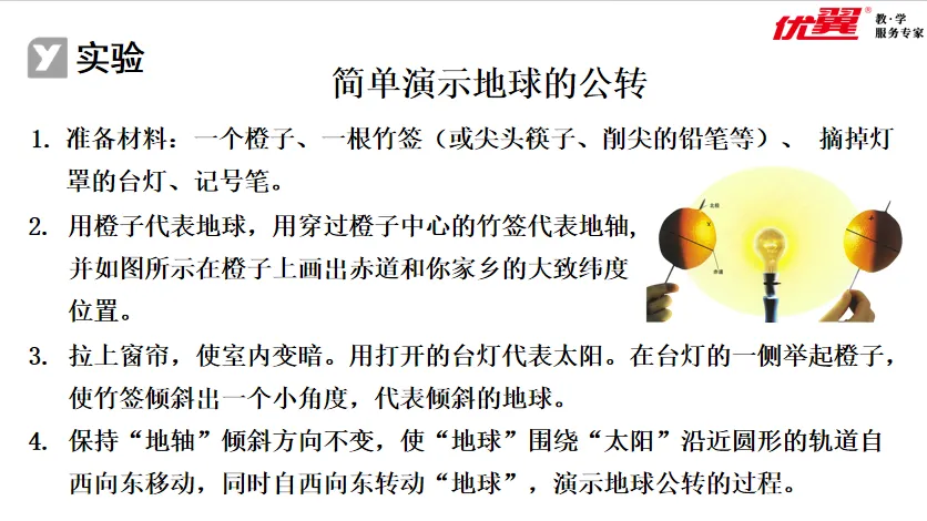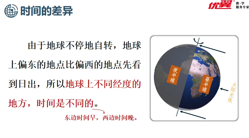 ①正确演示地球的自转,注意昼夜是怎样交替的。