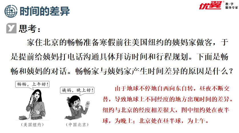 ④教材图1.17:在同一时刻,姨妈和畅畅互致问候时,为什么会有时间上的差异?如果畅畅中午12点打电话给姨妈是否合适?为什么?