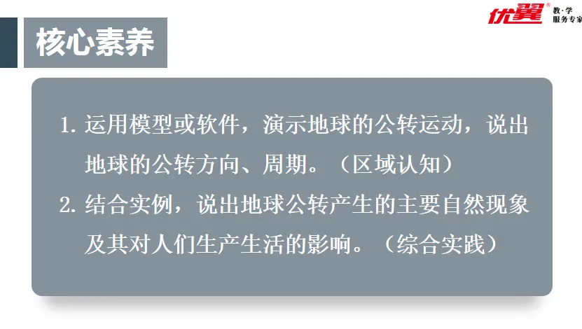1.运用模型或软件,演示地球的公转运动,说出地球的公转方向、周期。