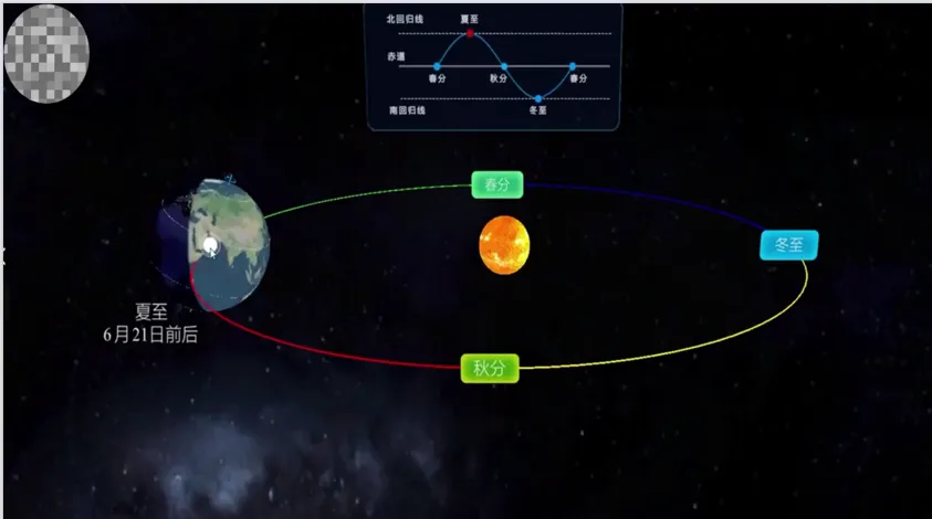 教师用鼠标控制,当地球公转到二分二至日点时,单击鼠标,使地球“停”下来,再单击使该区域放大,指导学生观察太阳直射的纬线。