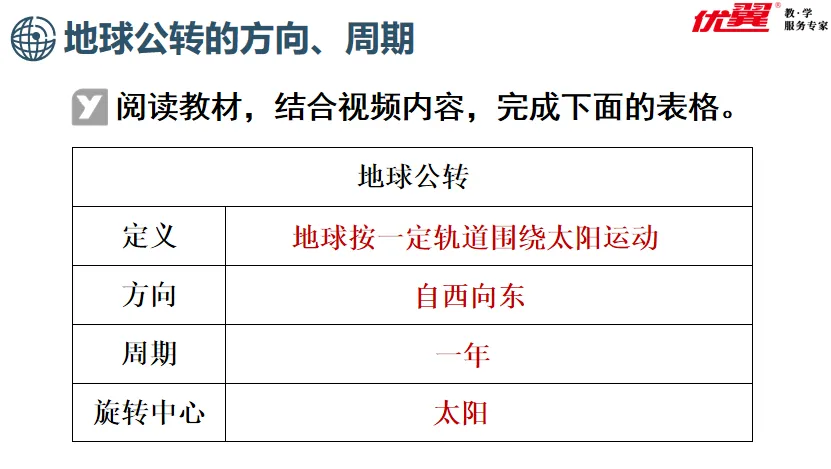 教师总结:指导学生读教材图1.19,“地球公转示意图”,完成表格。