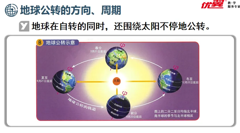 教师总结:地球在自转的同时,还围绕太阳不停地公转。